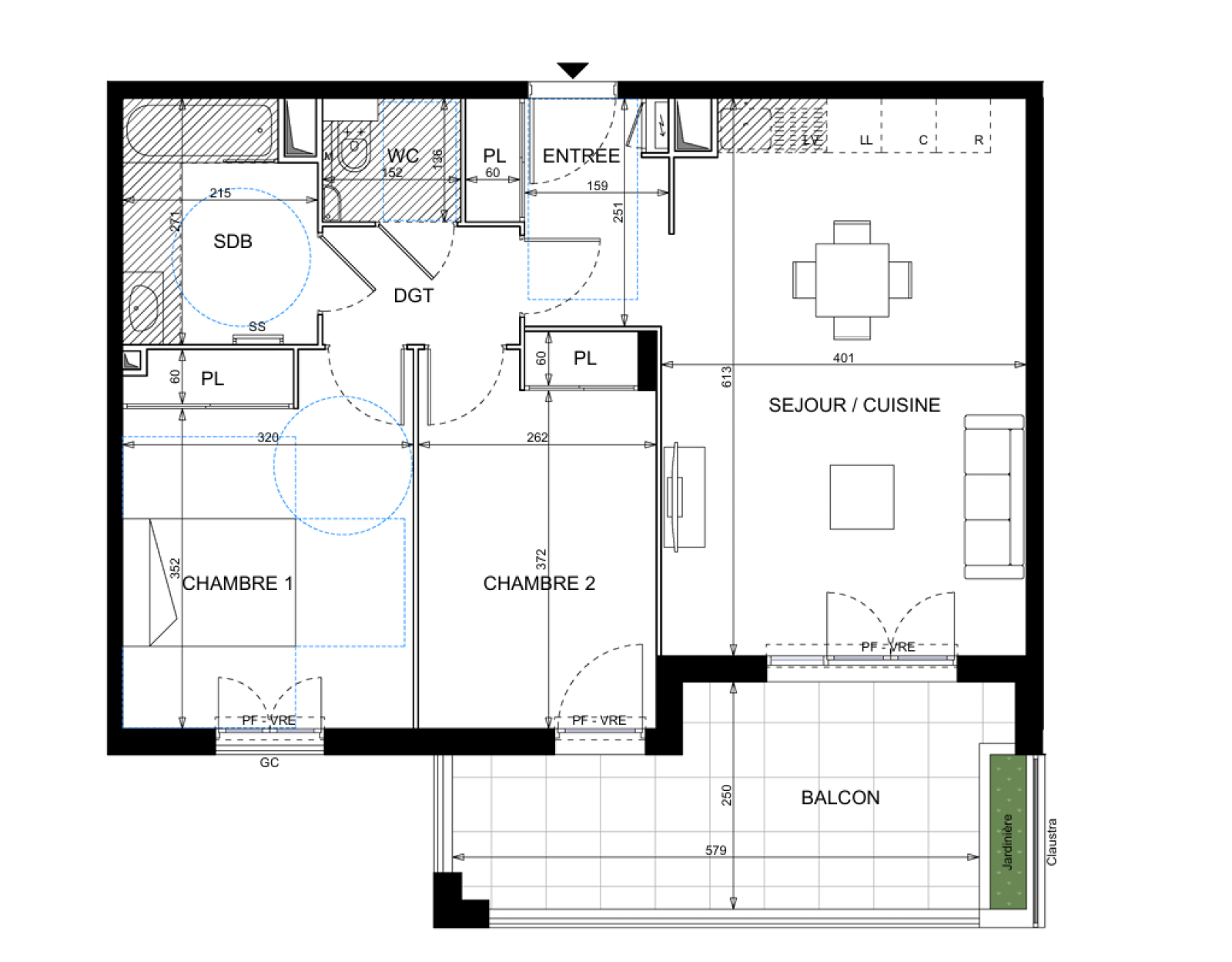 T3 de 63 m² au 1er étage avec un balcon de 13 m² exposé SUD, une pièce de vie de 24 m² et deux chambres de 11 et 13 m².