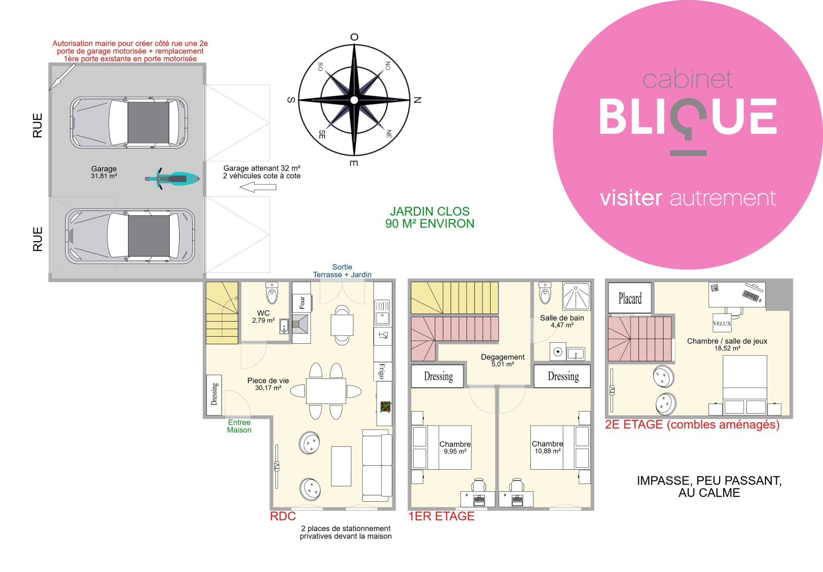 Mais ce n’est pas tout, pour définitivement AVOIR TOUT D’UNE GRANDE, cette maison a été améliorée par le propriétaire, à savoir par la création en 2022 d’une porte fenêtre triple vitrage depuis la pièce de vie vers le terrain attenant derrière pour ainsi créer un espace extérieur de 90 m². En pleine ville, incroyable ! Et pour parfaire ses ambitions d’AVOIR TOUT D’UNE GRANDE, elle bénéficie d’un garage attenant de 32 m² environ (en sus du prix affiché) pouvant accueillir aisément deux voitures côte à côte ainsi que du deux roues. Plus deux stationnements privatifs devant la maison en complément ! A ce stade désormais, je dirai même qu’elle en a plus que beaucoup de grandes !