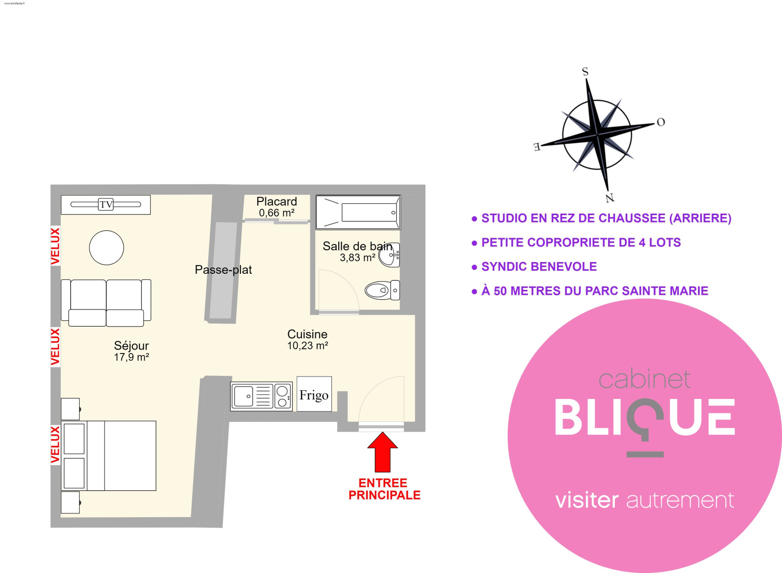 Fibre. Taxe foncière 539€. Charge 30€/mois. Chauffage électrique. DPE en D (tip-top).
