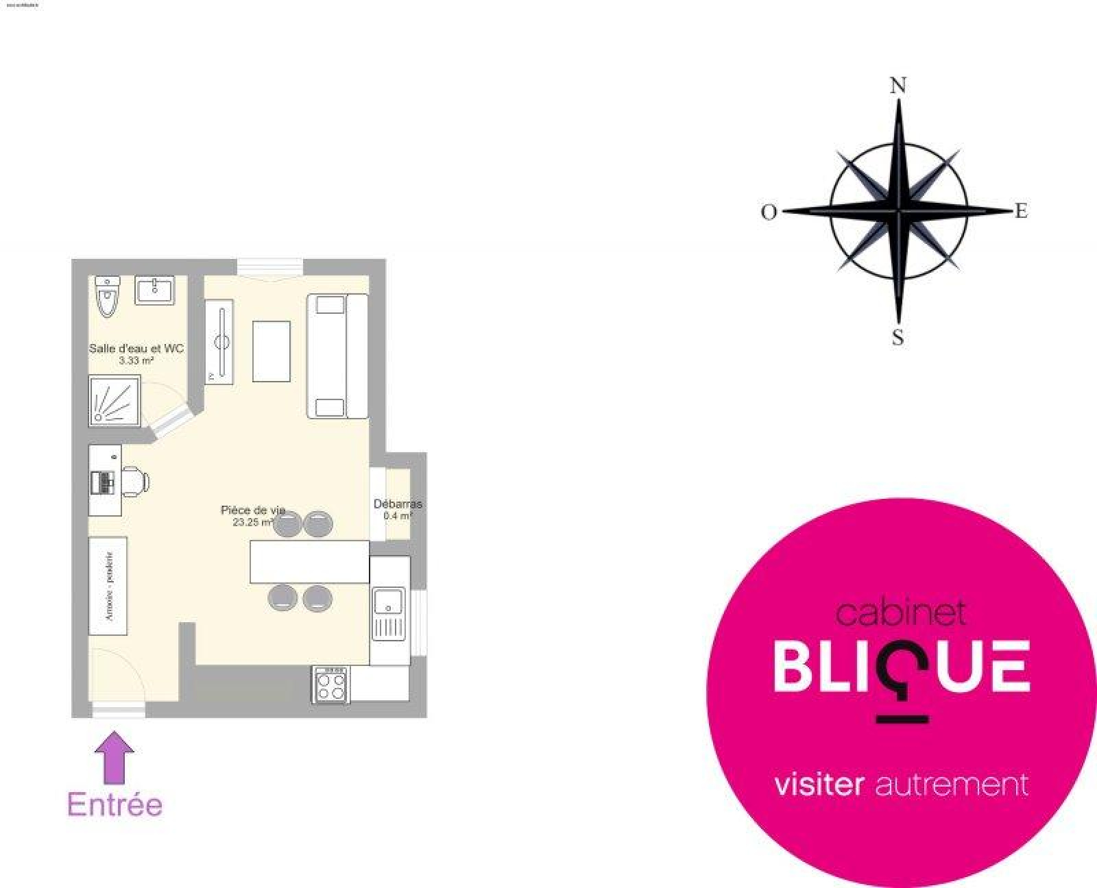 Ces 23 m² sauront vous contenter : une pièce de vie avec sa cuisine ouverte et une salle d’eau avec toilette.