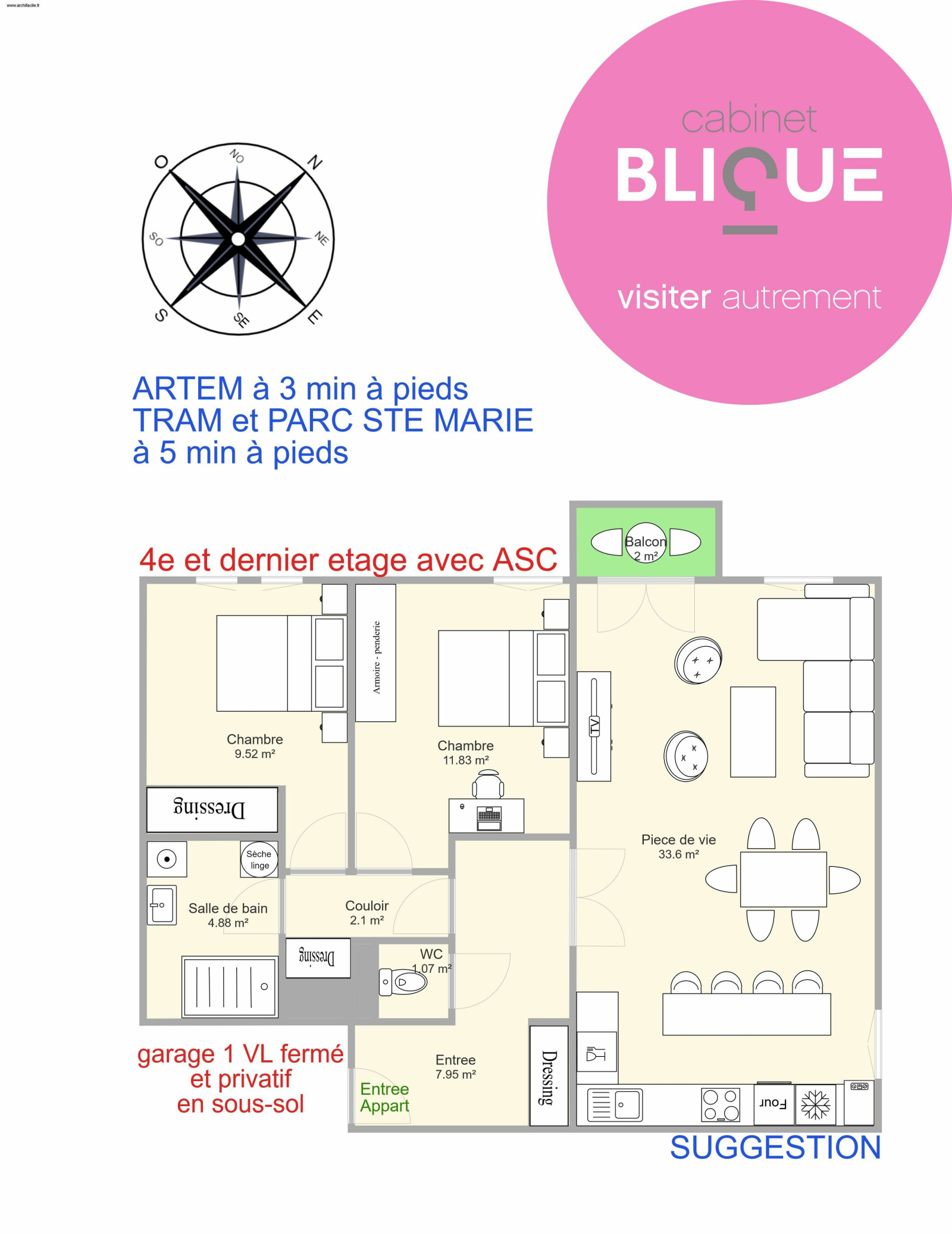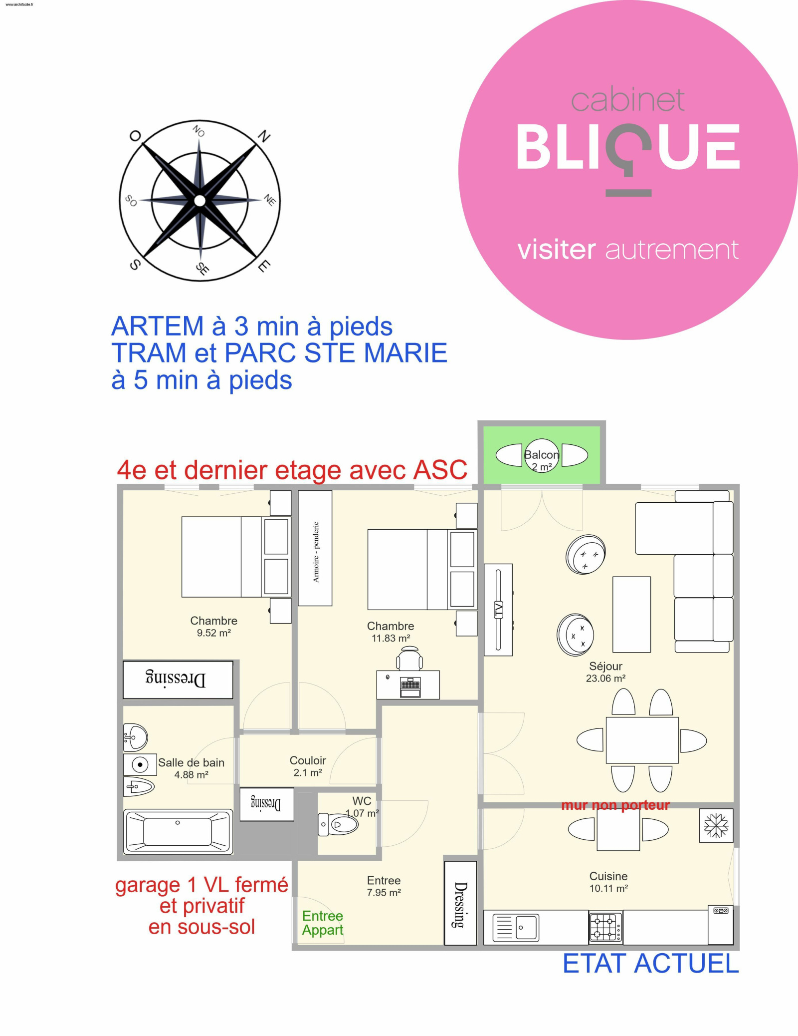COMBO GAGNANT pour son agencement actuel et la possibilité de le modifier facilement (voir plan photo N°9 et 10). Il se compose d’une entrée avec dressing (et un WC séparé) donnant sur la cuisine de 10 m² et le séjour de 23 m² avec balcon. Mur non porteur entre les deux donc possibilité d’y faire une belle pièce ouverte de 33 m². Ensuite un dégagement avec dressing également desservant les deux chambres (une de 12 m² et une de 9 m² avec dressing intégré) et la salle de bain.