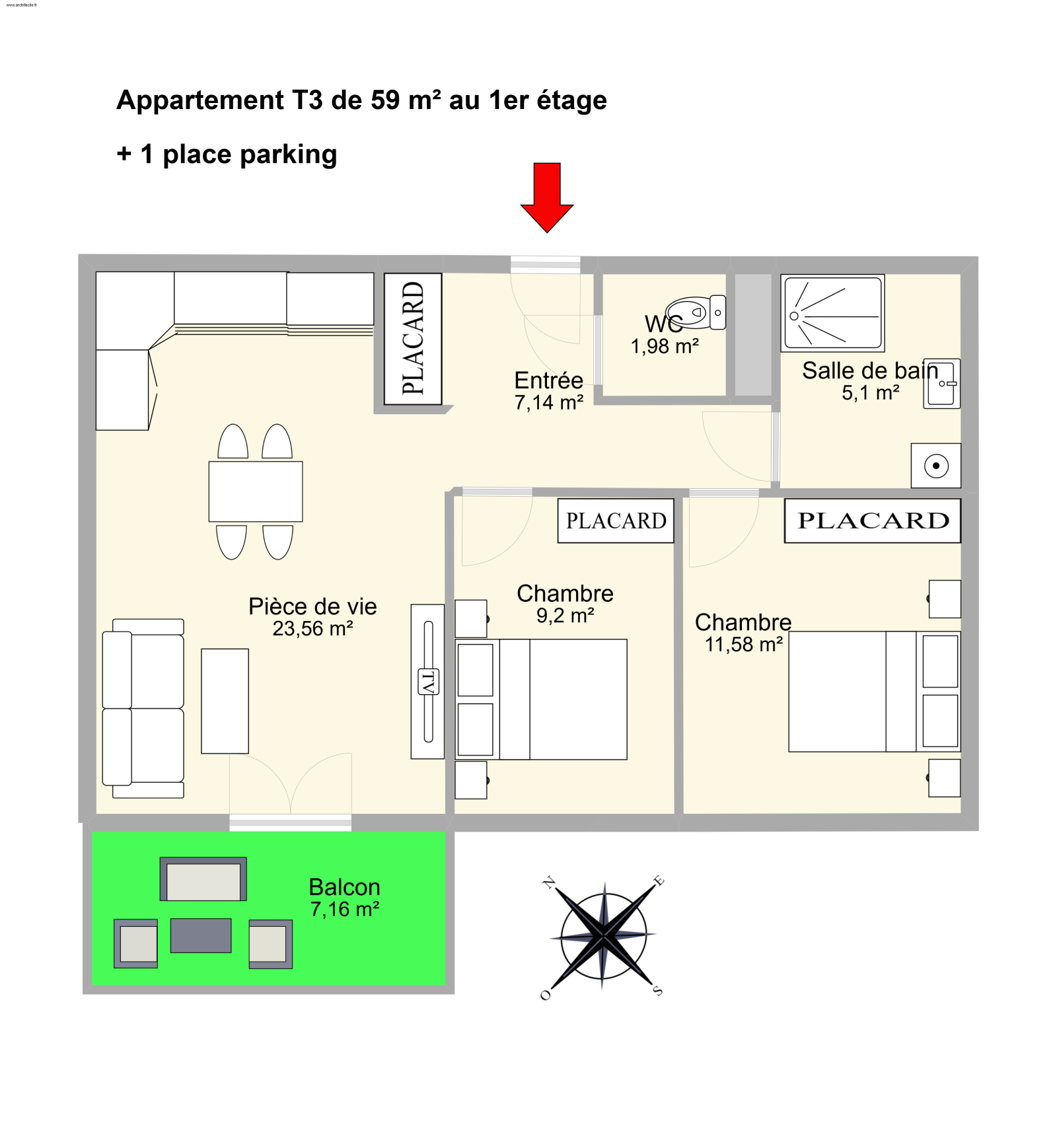Appartement T3 de 60.72 m² avec parking privatif et extérieur.
