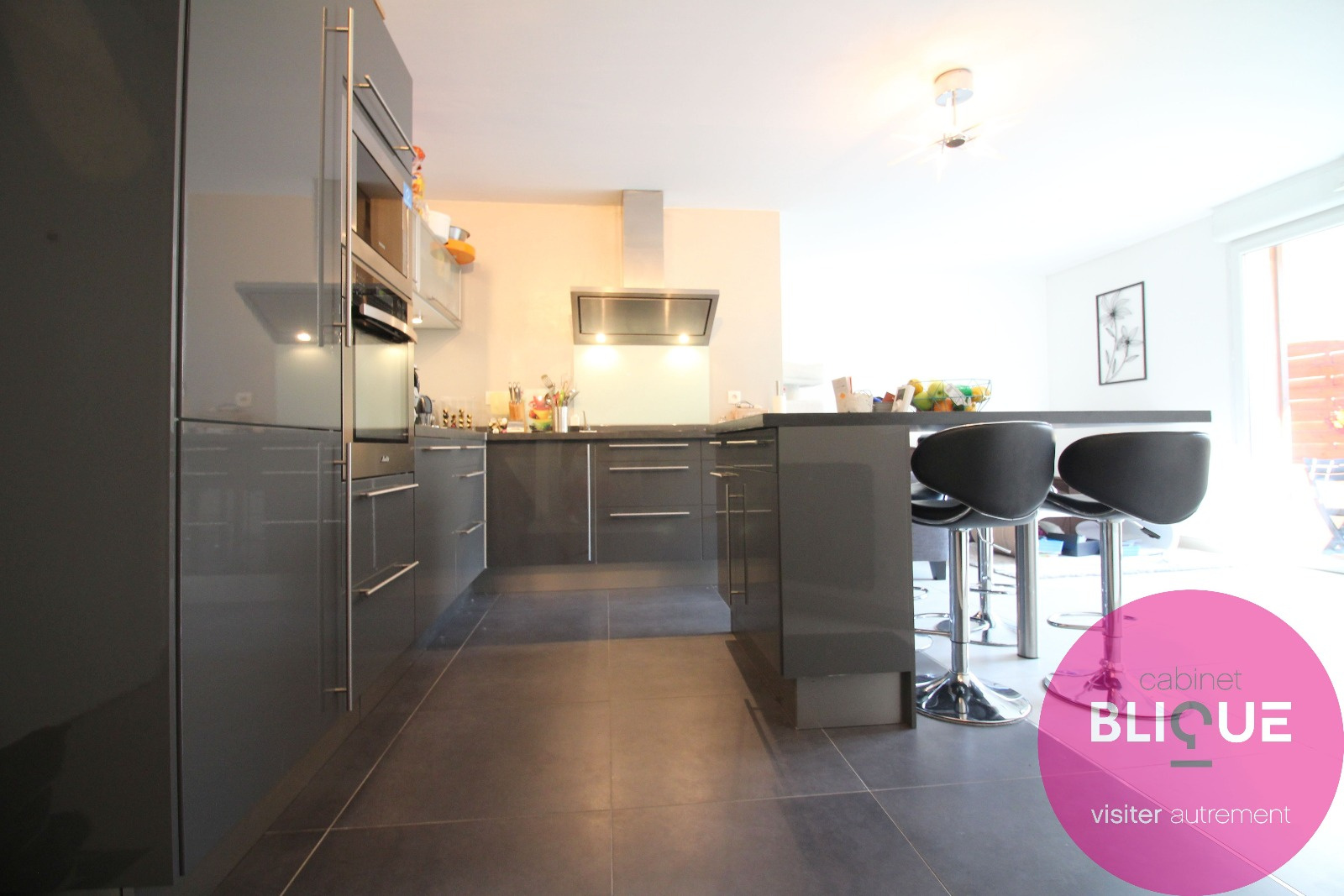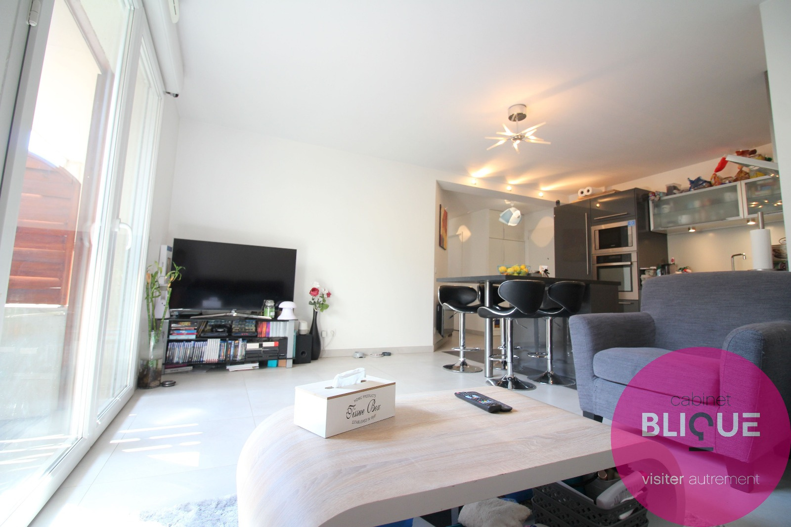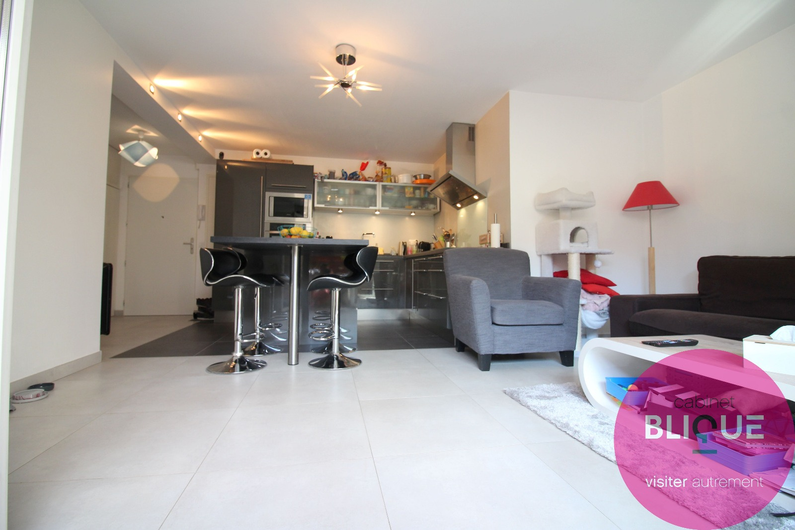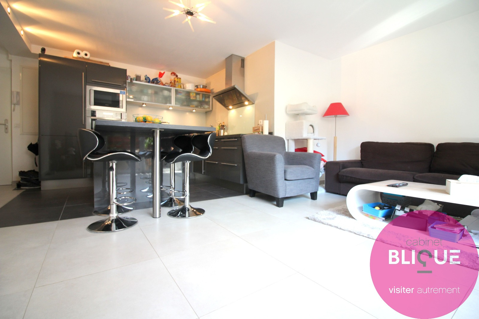 La pièce de vie est entièrement carrelée au sol sur ses 31 m², elle se compose d’une cuisine ouverte et design à l’américaine avec ilot central et accès à la terrasse de 6 m².