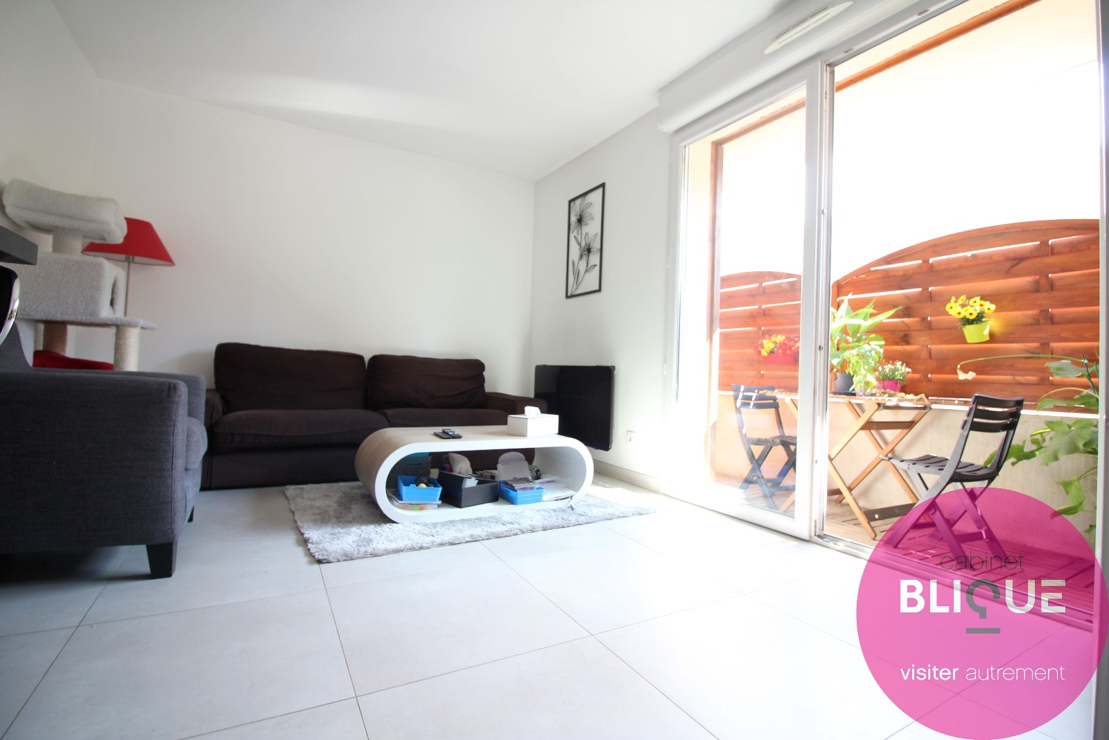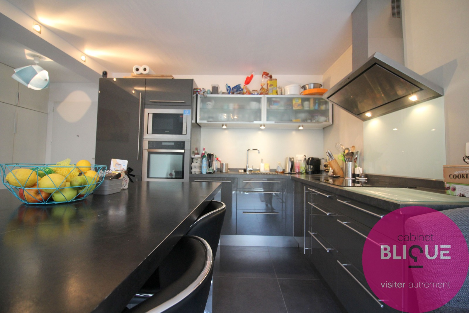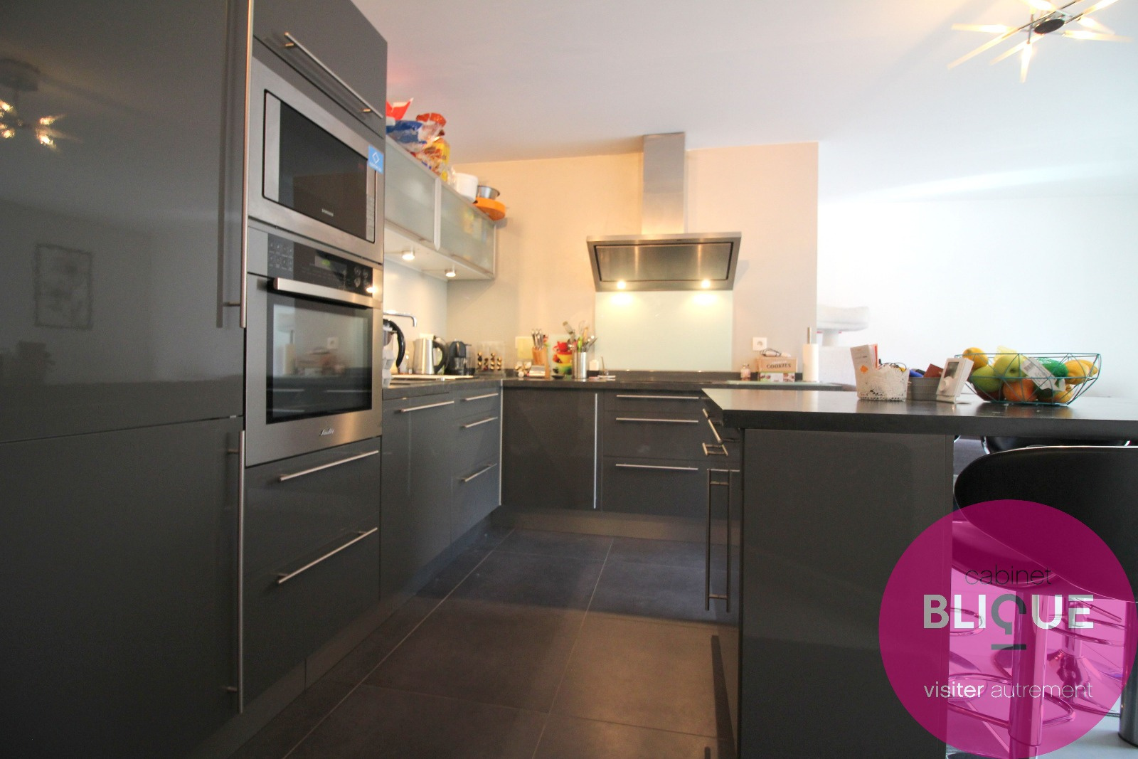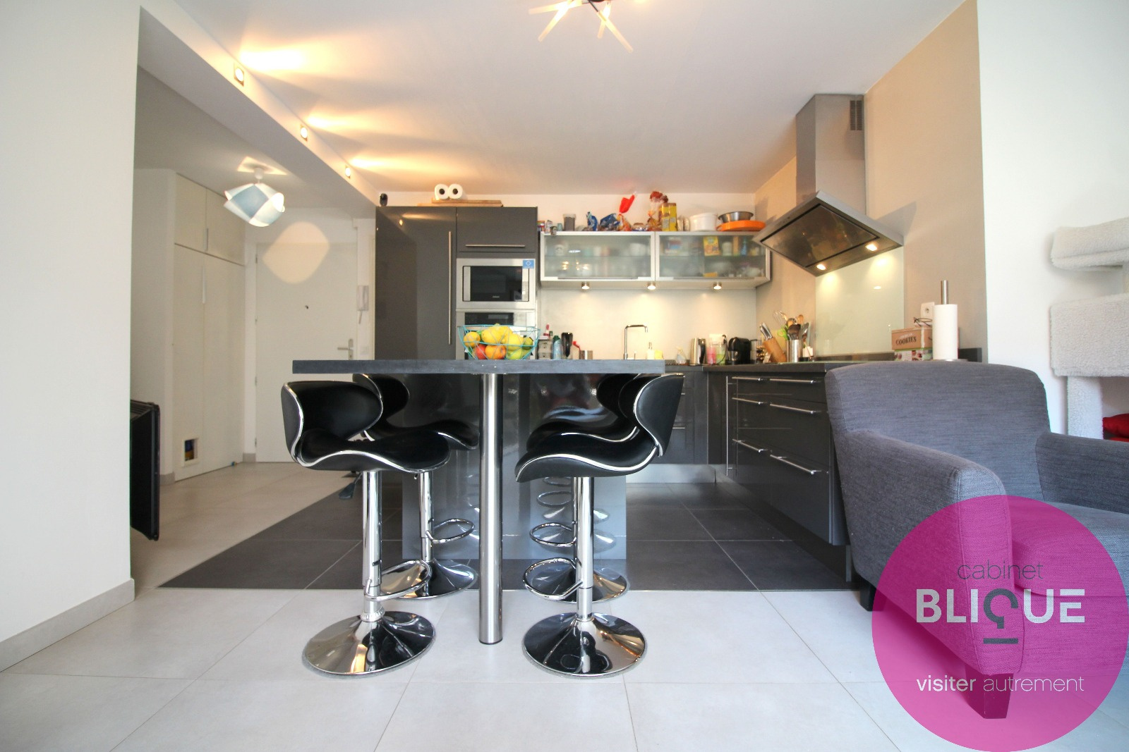 La pièce de vie est entièrement carrelée au sol sur ses 31 m², elle se compose d’une cuisine ouverte et design à l’américaine avec ilot central et accès à la terrasse de 6 m².
