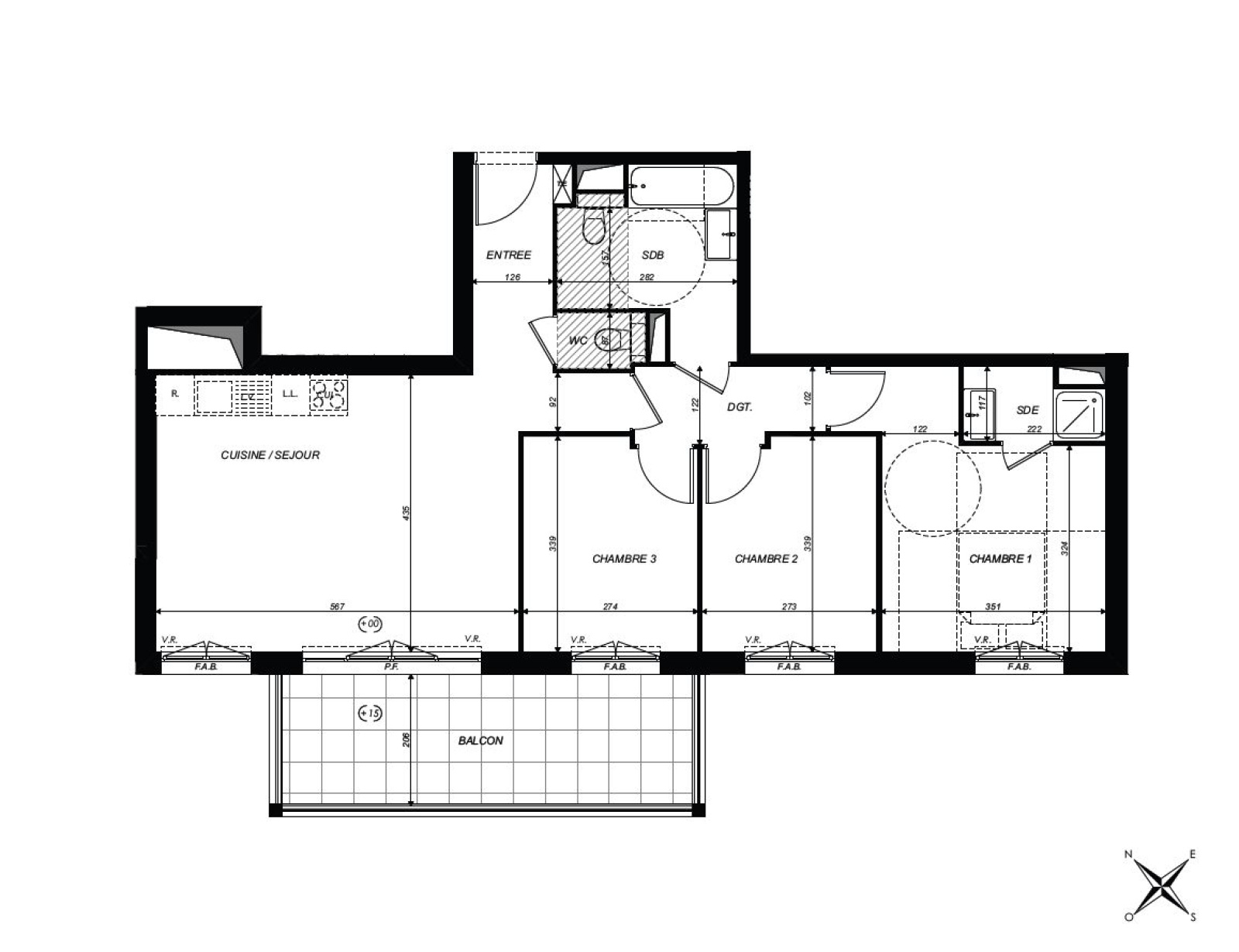 Ici, la lumière fait son show grâce à une double exposition et une hauteur sous plafond de 2,70 m qui donne de l’air à vos idées. Le séjour de 26 m² s’ouvre sur un balcon de 14 m² exposé Sud-Ouest, idéal pour vos apéros face au soleil couchant. Trois chambres pour accueillir enfants, colocataires, ou bureaux de télétravail (ou les trois, soyons fous), une salle d’eau pour les express, une salle de bains pour les longues journées. Et les WC séparés pour la paix des ménages, évidemment.
