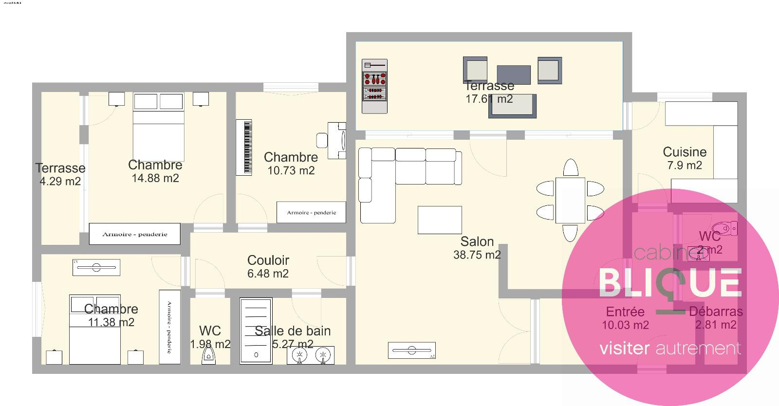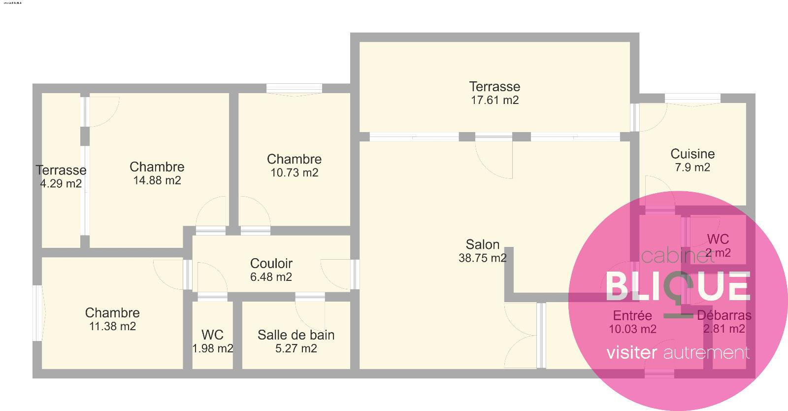 Pièce de vie de 40 m², 3 chambres de 15, 12 et 11 m² chacune, 2 terrasses de 18 et 5 m², 1 salle de bain de 6 m², 2 wc et une buanderie.