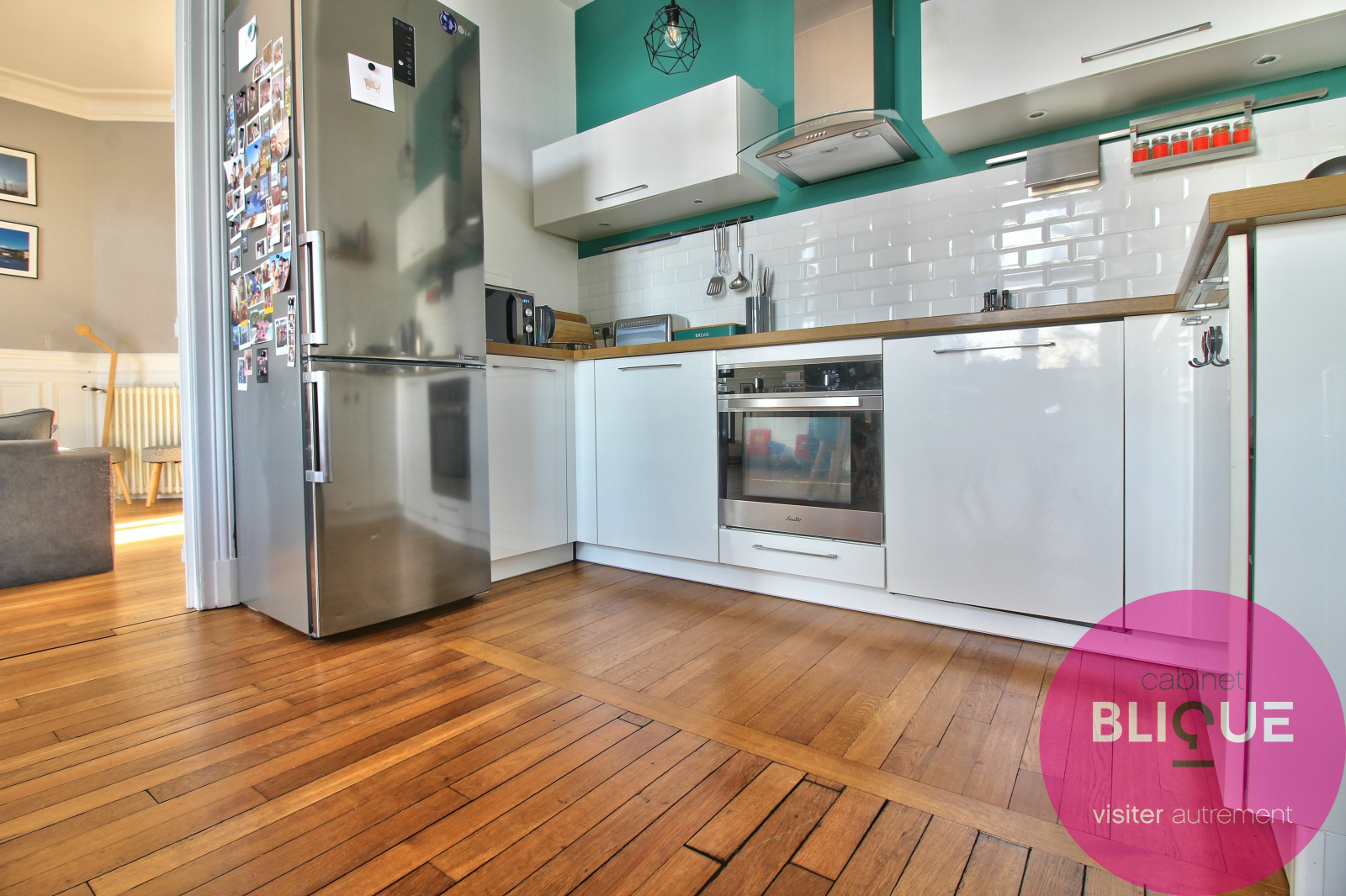 HAUSSMANNIEN ! Ça ne se discute pas : cimaises, moulures, parquet massif, cheminées, belle hauteur sous plafond, tous les marqueurs de l’haussmannien y sont. Plein de charme donc à retrouver ici et des volumes généreux : une pièce de vie ouverte de 39 m² avec cuisine équipée ; deux grandes chambres (communicantes si on le souhaite) de 14 et 17 m² dont la seconde avec un dressing indépendant de plus de 4 m² ; un bureau de 8 m² ; une buanderie ; une salle de bain elle aussi rénovée avec baignoire et douche ; WC séparés.