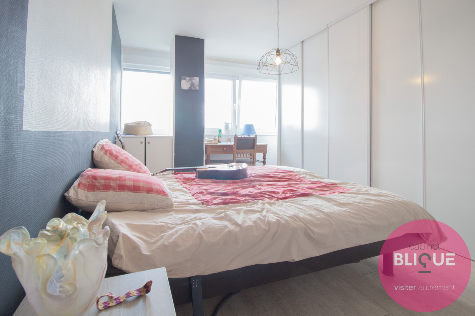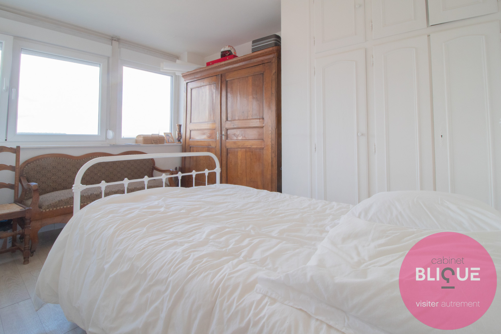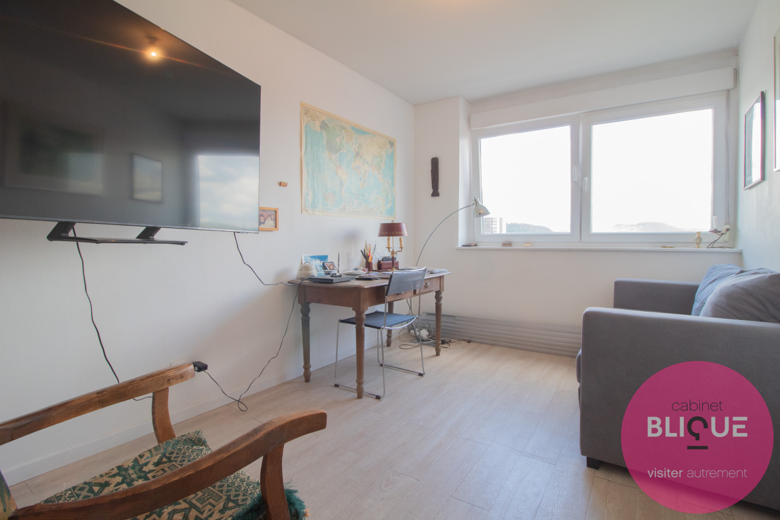 C’est un F5 : le salon-séjour est ouvert sur la cuisine avec vue sur la ville (wahouu), quatre chambres, une salle de bain avec baignoire et une autre avec douche (en mode détente totale), un toilette séparé (là c’est le mode tranquillité) et des placards.
