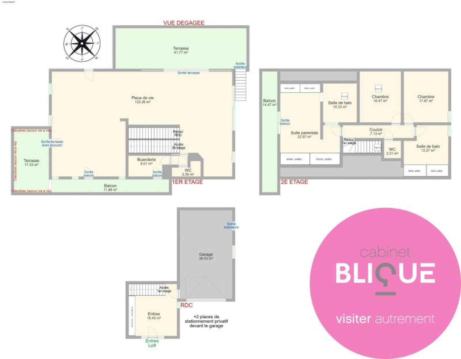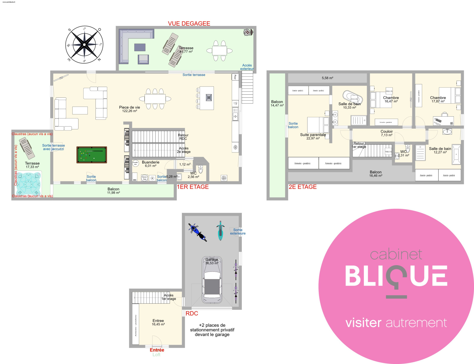 Au rez-de-chaussée entrée privative de 16 m² avec un grand dressing et un garage de 36 m².