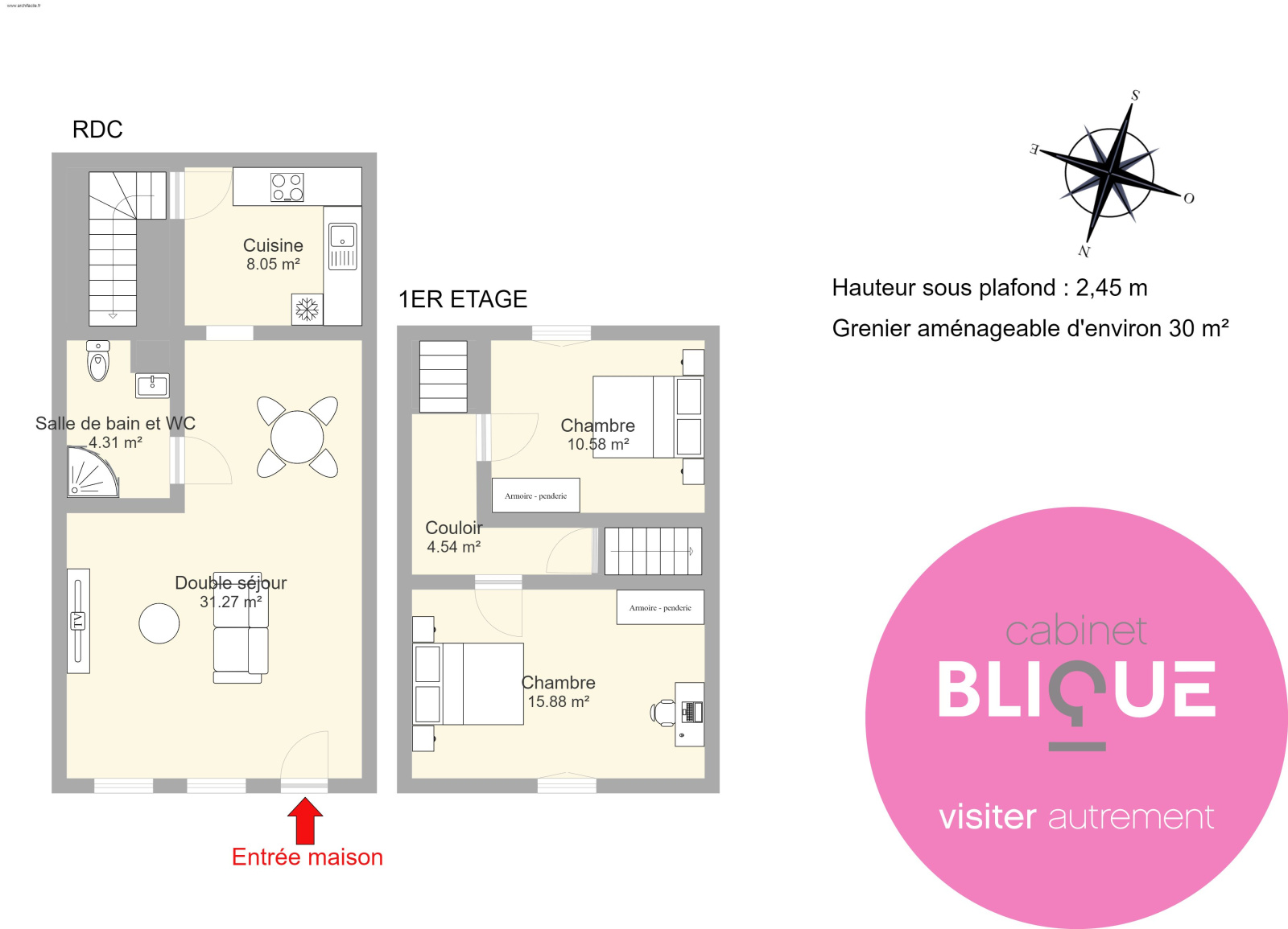 75 m² habitables et 25m² de combles ! Si j’avais un marteau, je verrais tout de suite le potentiel !