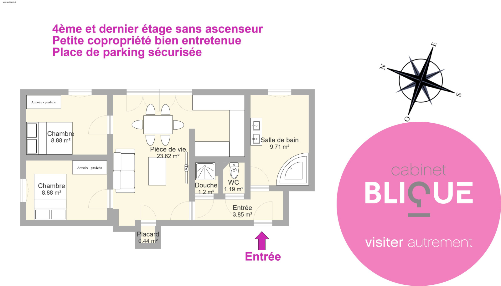 Cap, nous grimperons au 4ème étage sans ascenseur dans une petite copropriété bien entretenue avec un parking sécurisé !