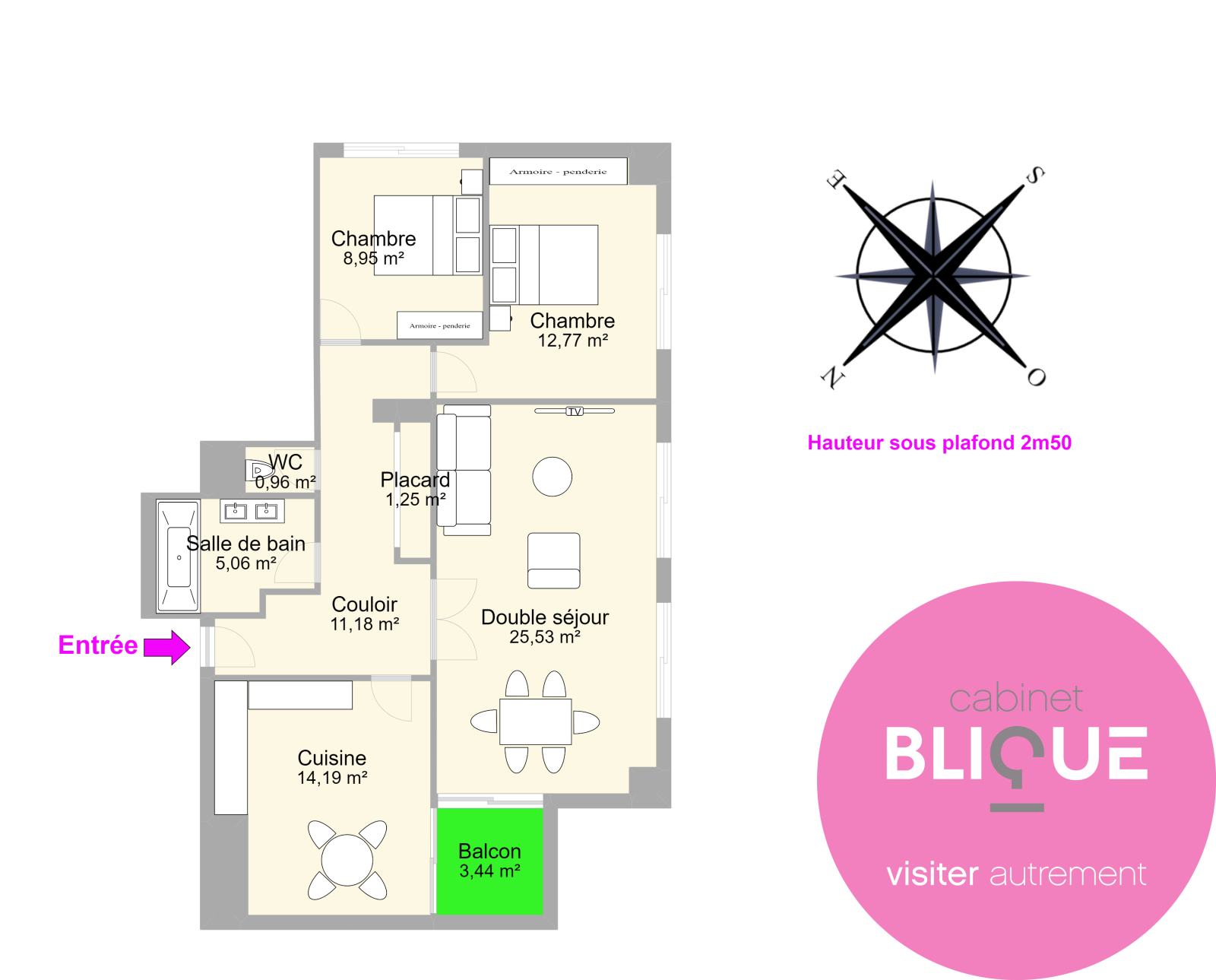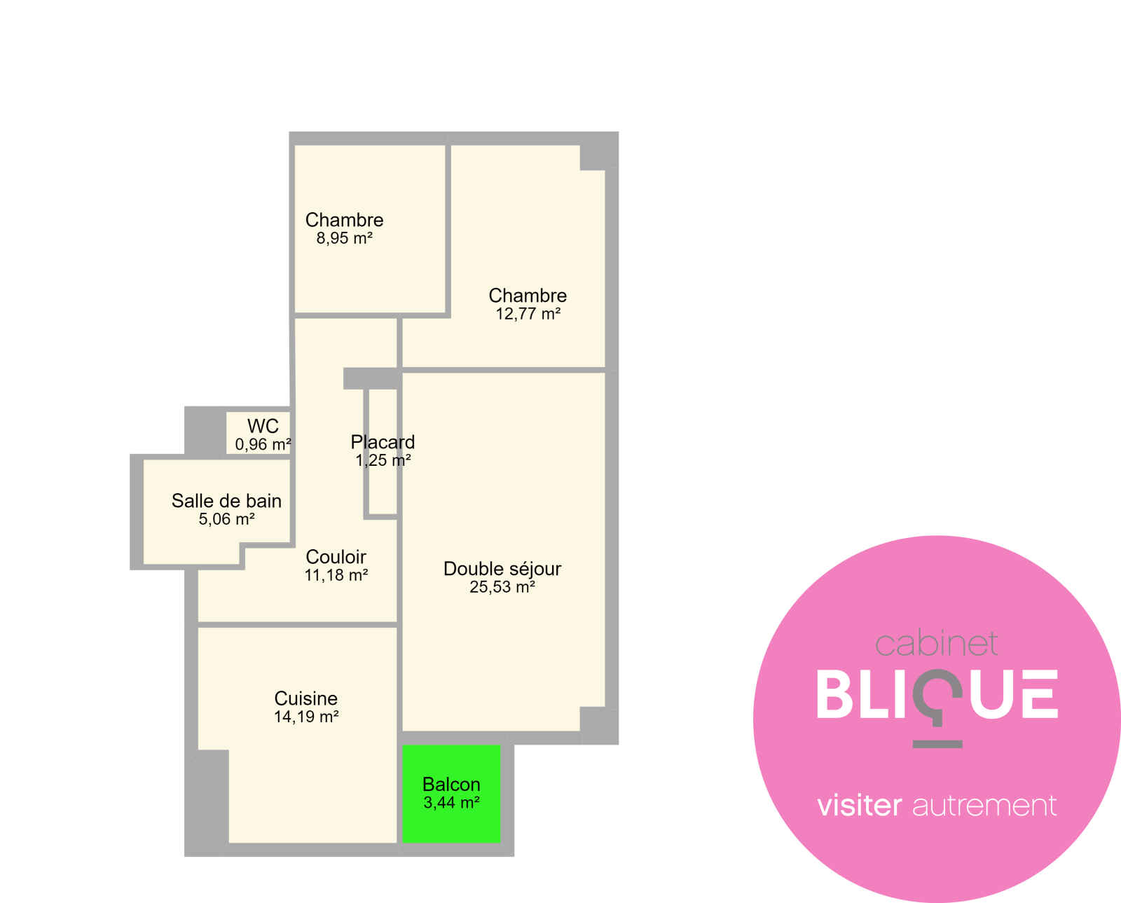 Ho là je suis là, un appartement de 79 m², avec ses 2 chambres, sa pièce de vie de 26 m², sa cuisine séparée et son balcon.