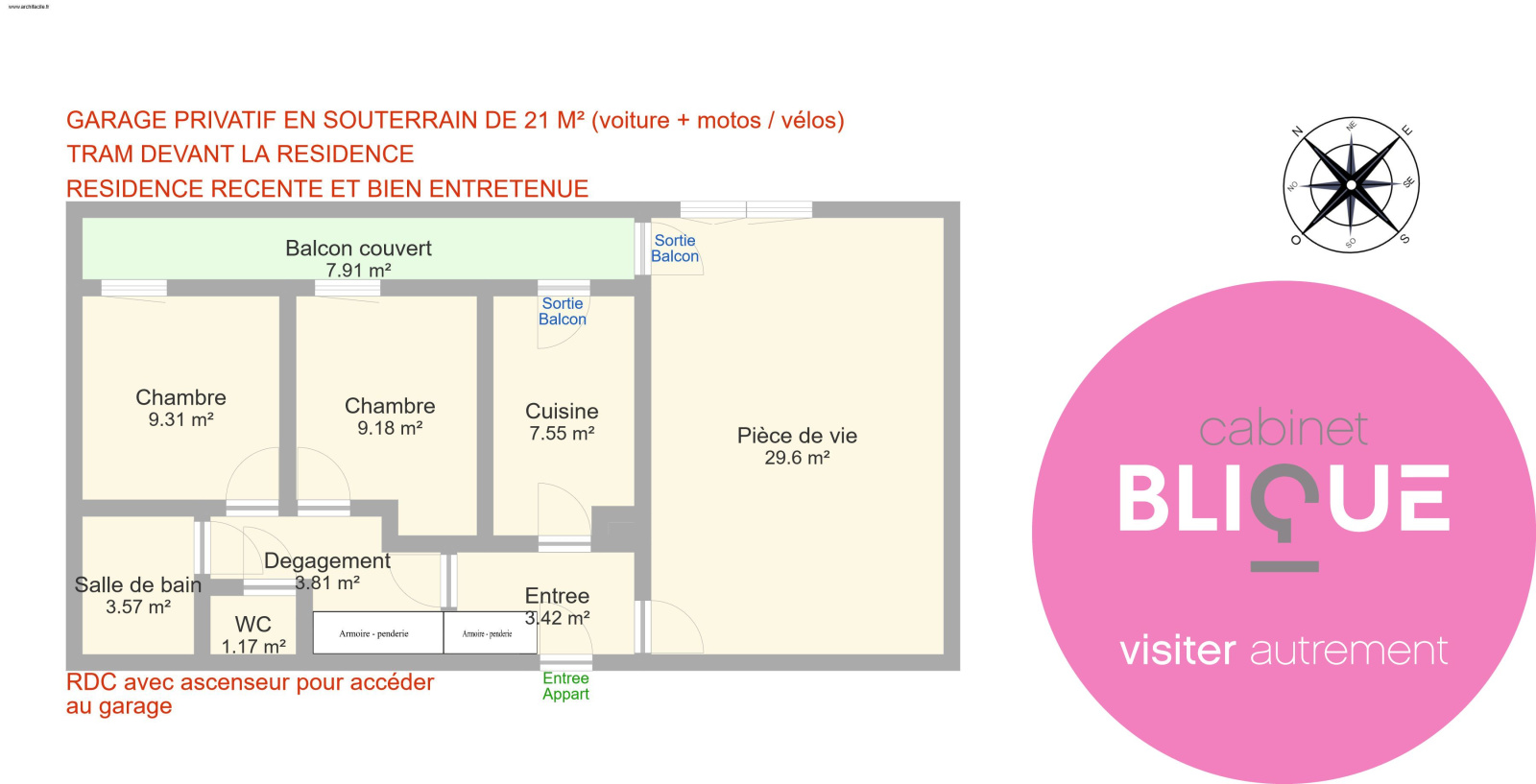 La résidence est donc récente, sécurisée, bien entretenue et aménagée pour les personnes à mobilité réduite (larges couloirs, interrupteurs à mi niveau, aucune marche). L’appartement se situe en accès handicapé au RDC mais donne sur l'arrière au 2e étage donc pas de fenetres accessibles depuis l'exterieur. Il dispose d'un cellier indépendant au même niveau que l'appartement et d'un accès au garage privatif fermé en souterrain par ascenseur. Le garage est de grande taille (21 m²) et permet donc sans problème de mettre un véhicule et vélos / moto. Proche Nancy et Brabois.