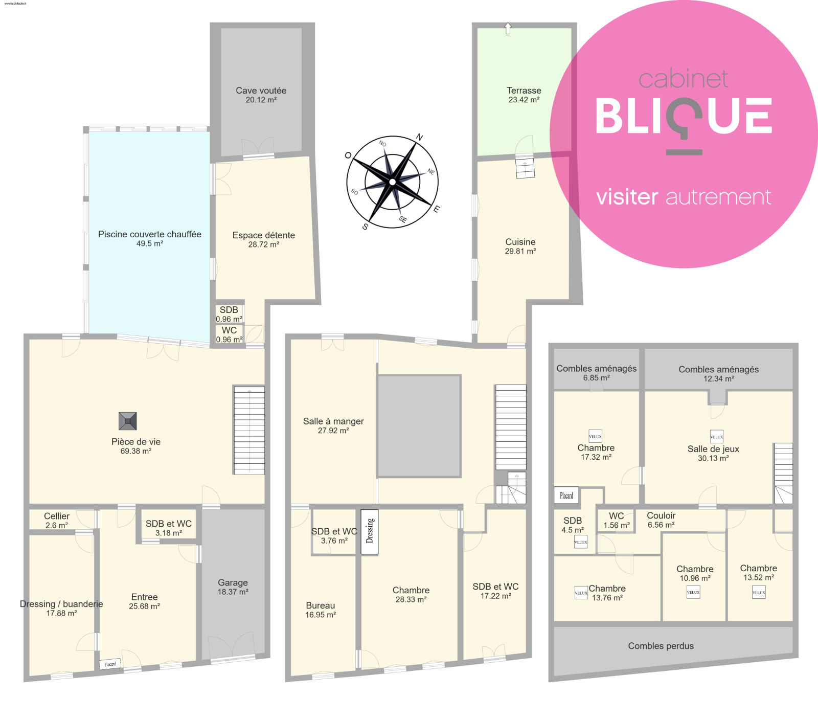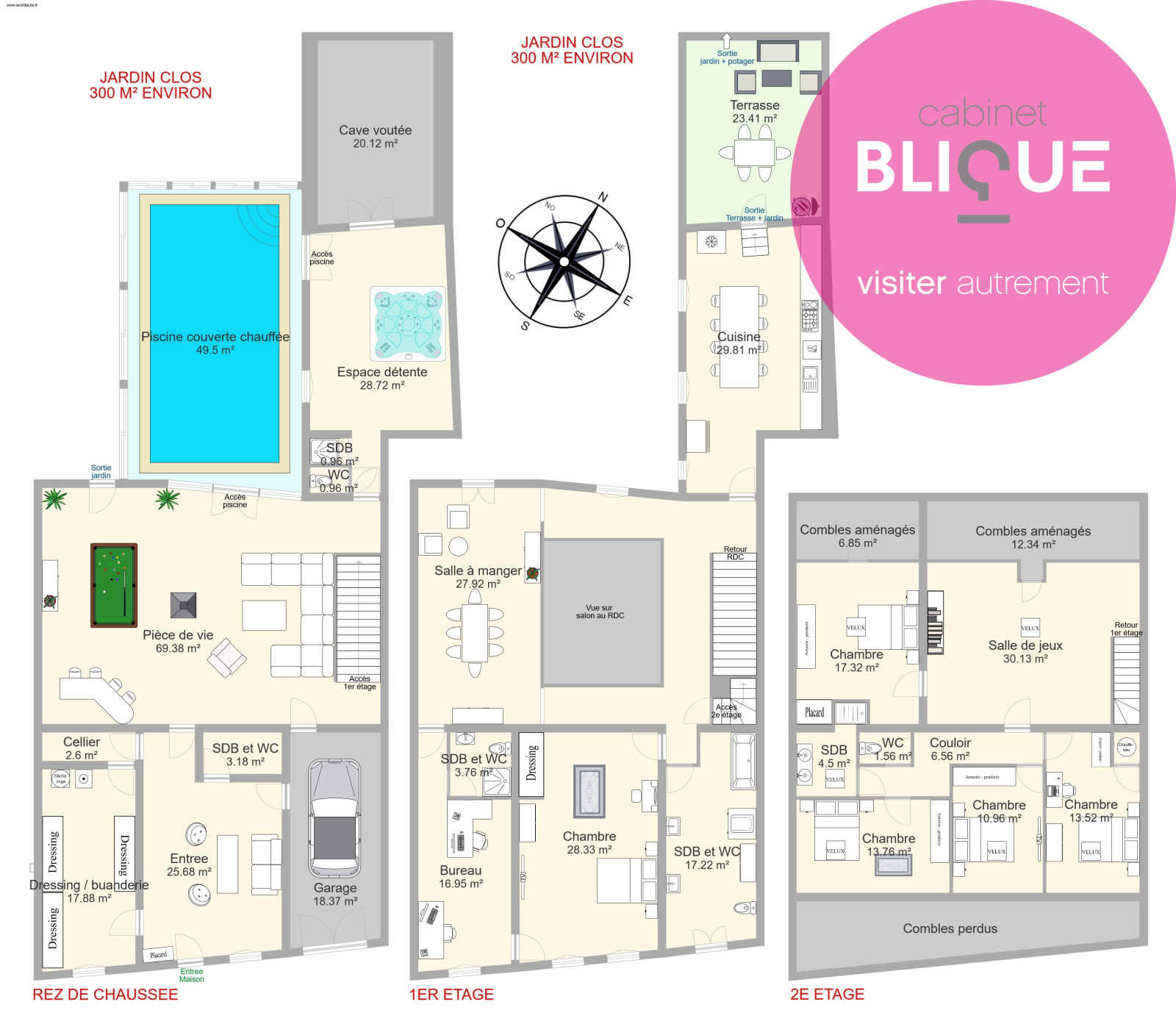 PARESSE : 395 m² habitables, entrée de 36 m², pièce de vie de 70 m² avec cheminée centrale et accès piscine couverte et espace détente, cuisine de 30 m² entièrement équipée refaite en 2014, salle à manger de 28 m² (voir plan photo N°10), 6 chambres de 11 à 28 m², salle de jeux de 30 m², 4 salle de bains et 4 WC, dressing/ buanderie de 18 m²…. Il est clair que pour se détendre et embrasser la paresse, ce n’est pas la place qui manque.