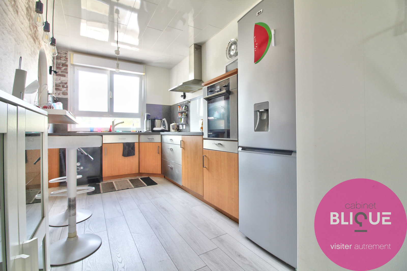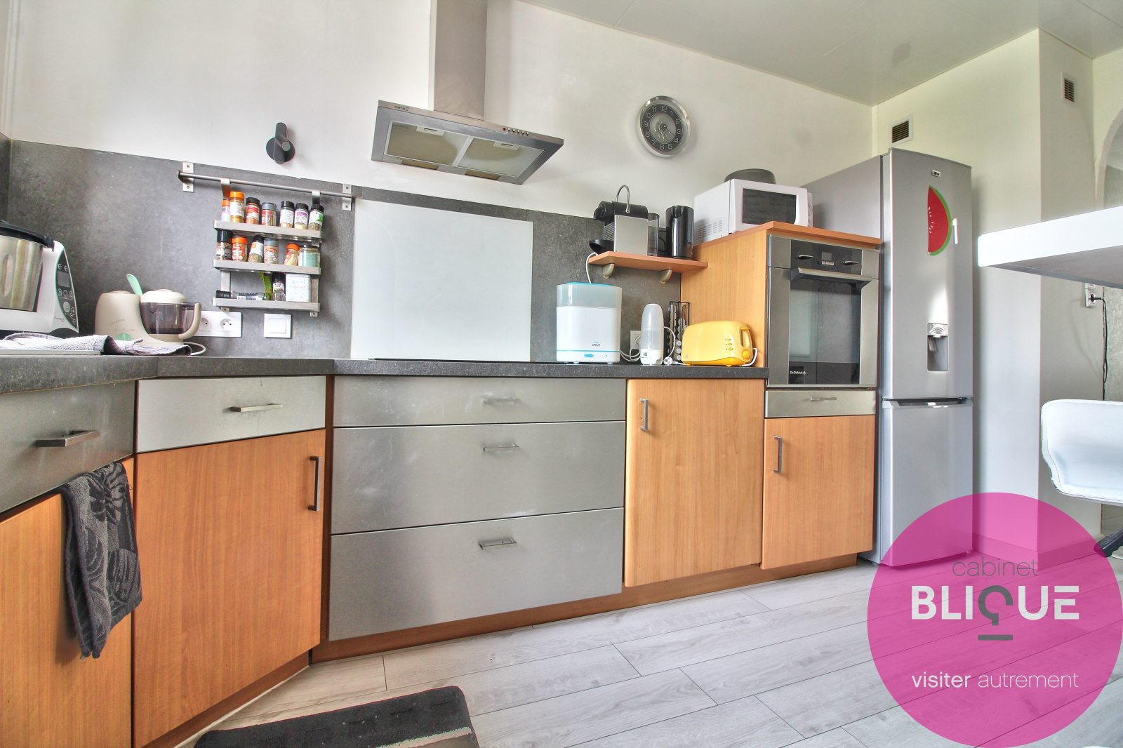 Belle pièce de vie lumineuse de 45 m² avec cuisine ouverte et équipée. Celle-ci donne sur la buanderie, bien pratique tout ça.