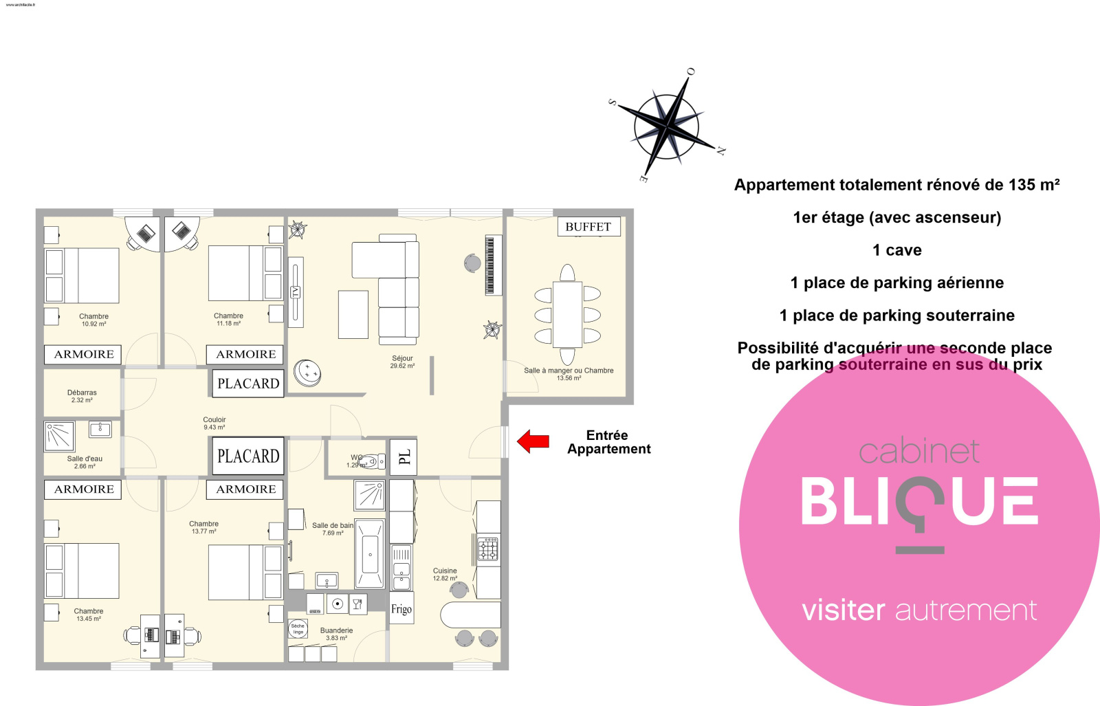 Côté rangement ce n’est pas moins de 3 placards et un débarras (plus la buanderie) et une cave en rez-de-chaussée.