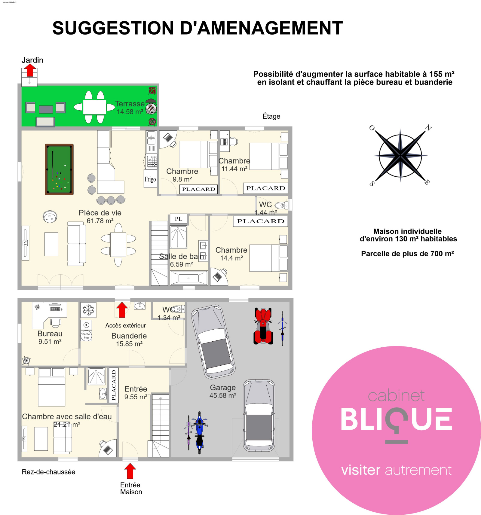 Du potentiel : vous pourrez transformer l’atelier en bureau en isolant et en chauffant et idem pour la buanderie. Soit passer la surface habitable à 155 m², la classe !
