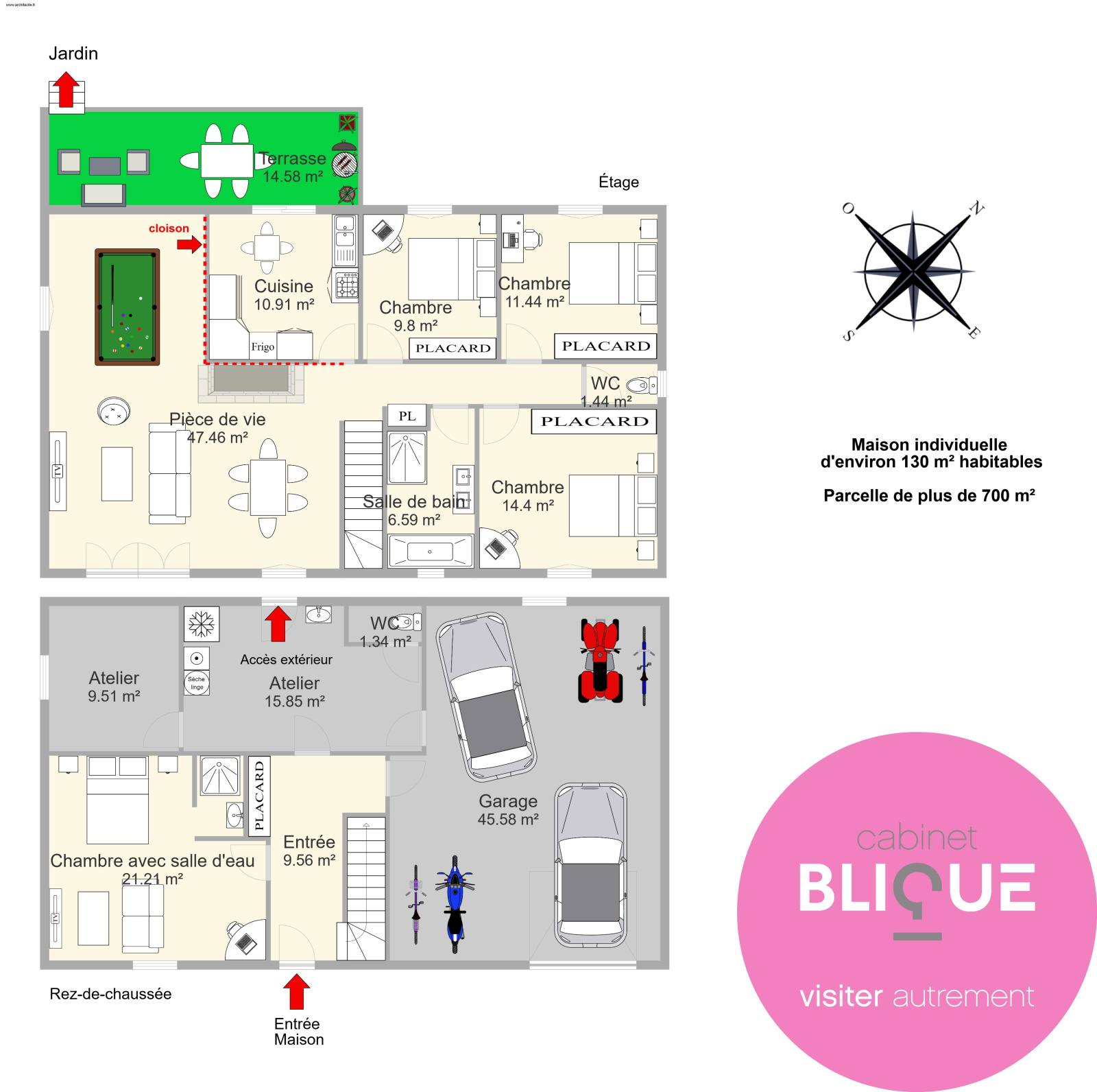 Celle-ci vous propose au rez-de-chaussée une belle entrée de 10 m² avec un placard, une chambre de 21 m² avec sa salle d’eau, un atelier, une buanderie et un grand garage de 45 m².