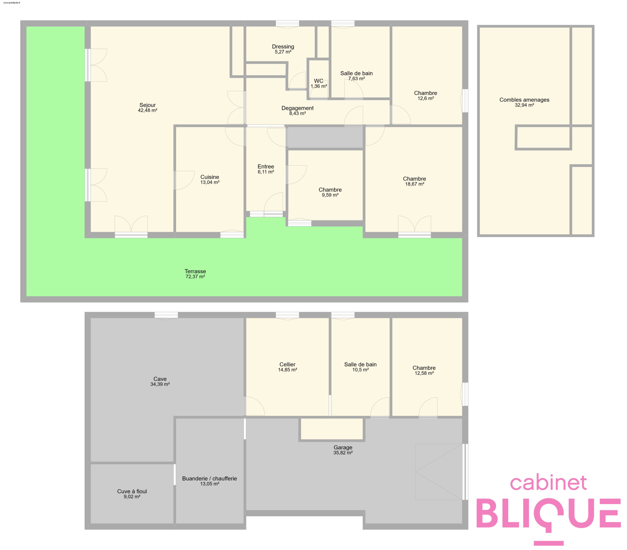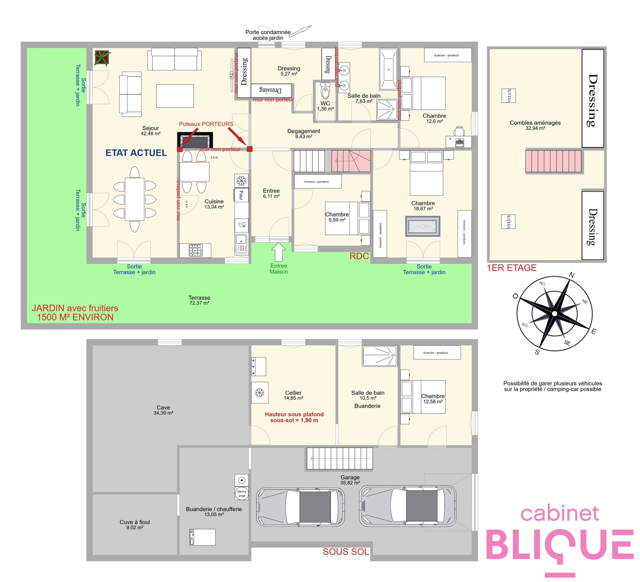 À l’étage, les combles aménagés en 2019 offrent un espace climatisé multifonctions : bureau, salle de jeux ou chambre d’ami (voir plans photos N°10 et 11). En sous-sol, place à la praticité avec garage, cave, cellier, buanderie, chambre d’appoint et chaufferie. Attention, plafond à 1m90 : les basketteurs sont priés de rester à l’étage.