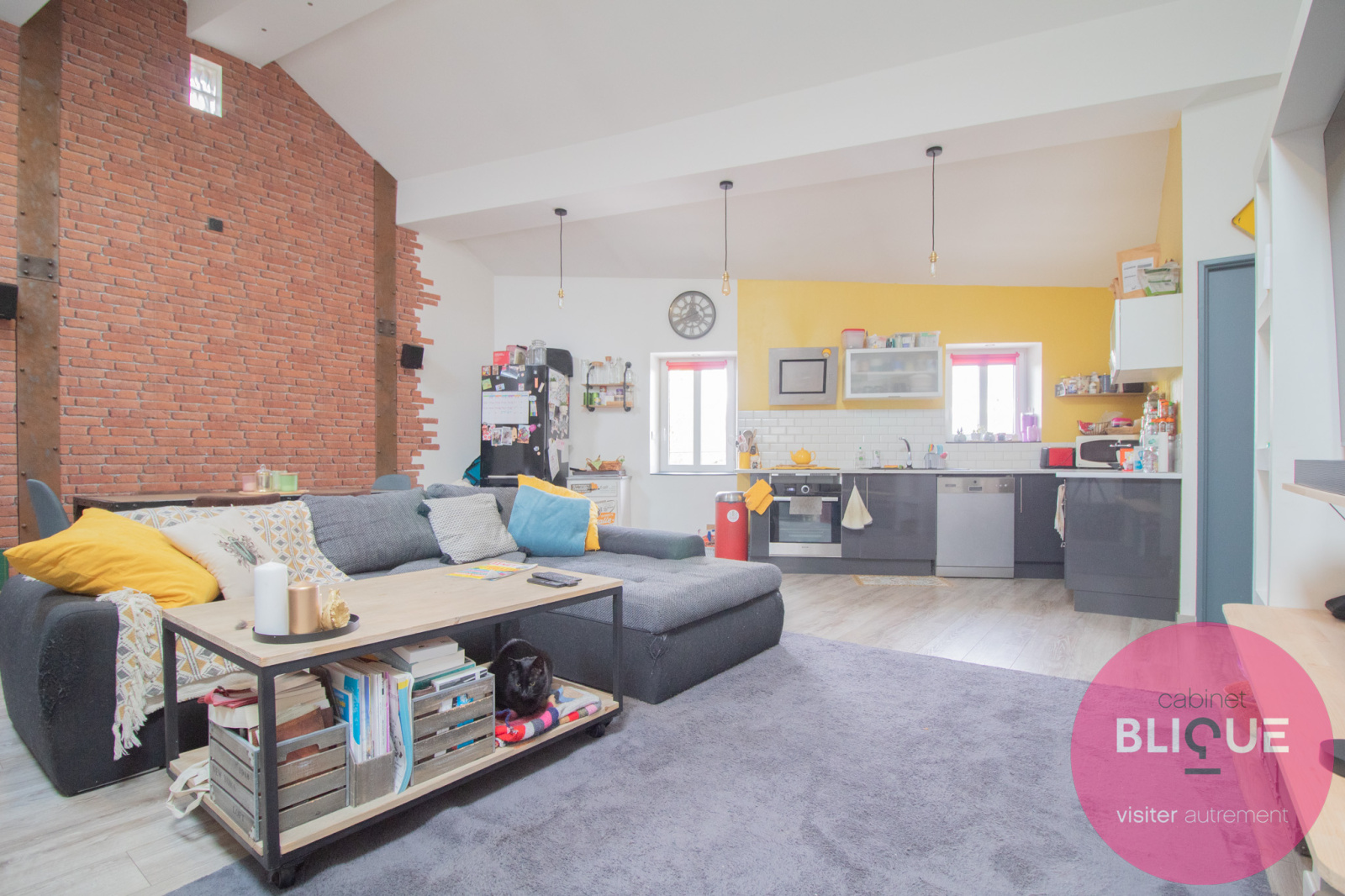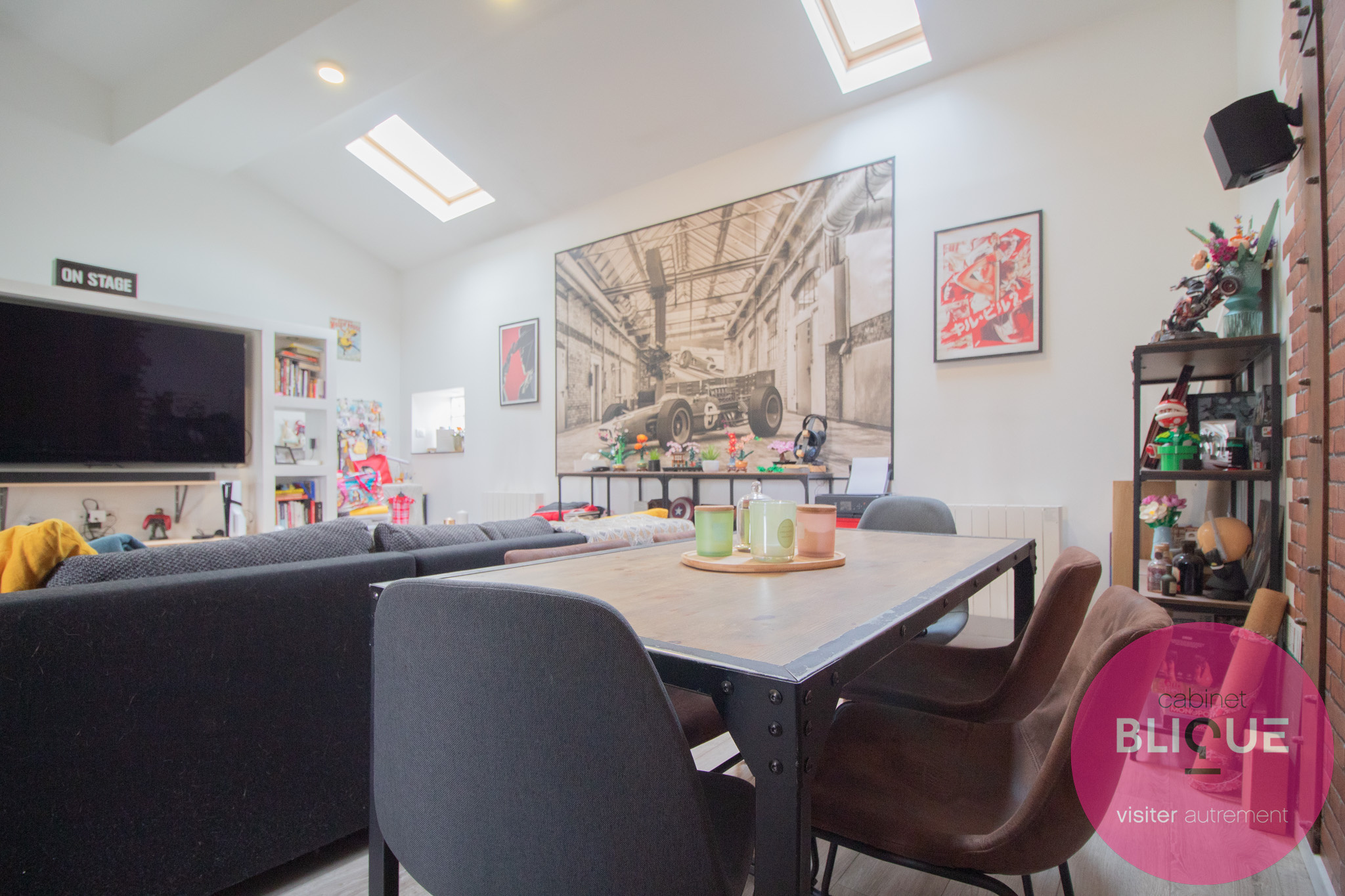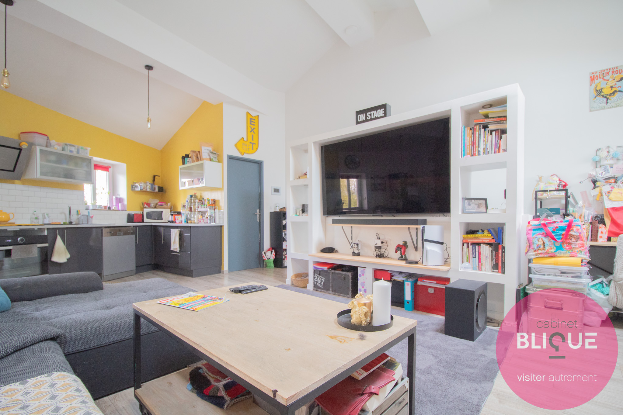 De l’art cet appartement de 90 m² : une pièce de vie de 38 m² à l’esprit loft avec des poutres apparentes pour le côté industriel et une hauteur sous-plafond de 3.80 mètres au plus haut. Pratique le cellier, ou pièce à bazar à côté de la cuisine ouverte !