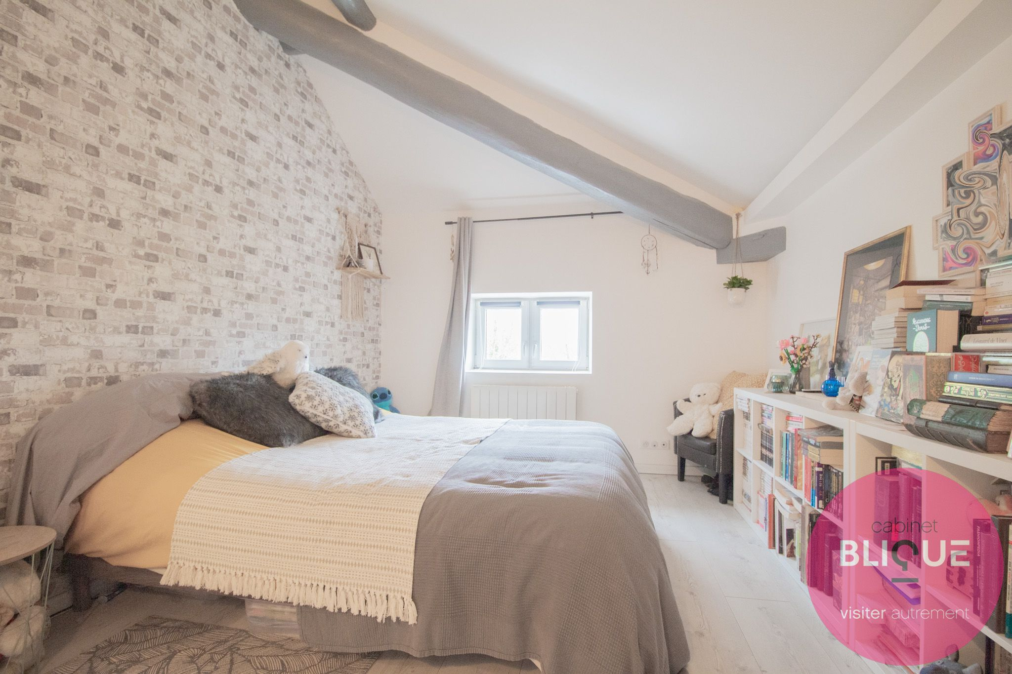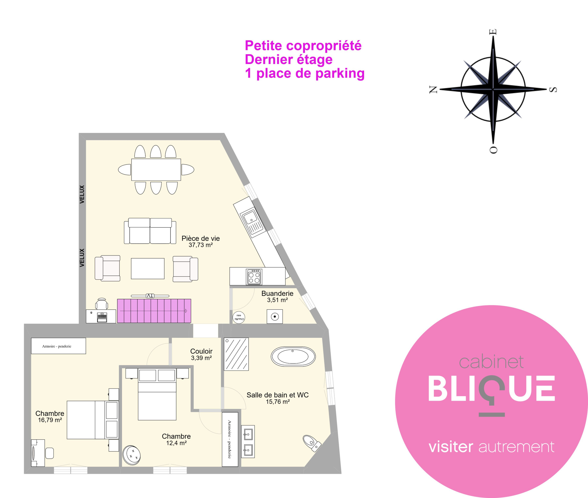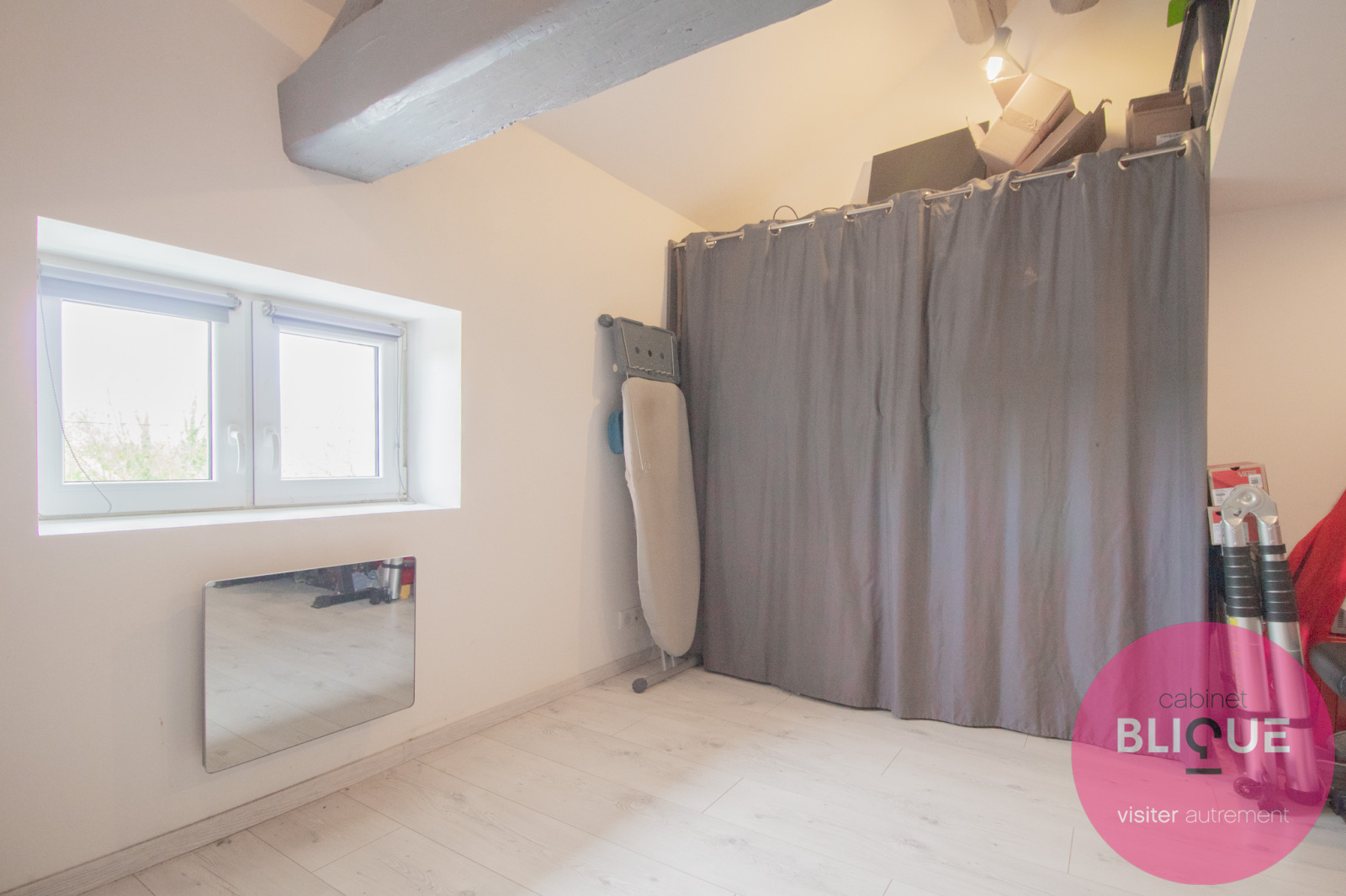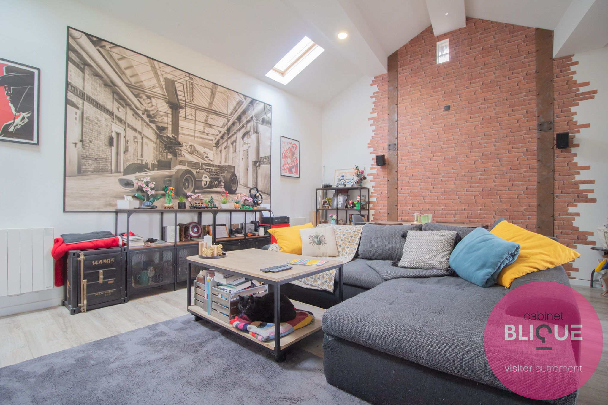 De l’art cet appartement de 90 m² : une pièce de vie de 38 m² à l’esprit loft avec des poutres apparentes pour le côté industriel et une hauteur sous-plafond de 3.80 mètres au plus haut. Pratique le cellier, ou pièce à bazar à côté de la cuisine ouverte !