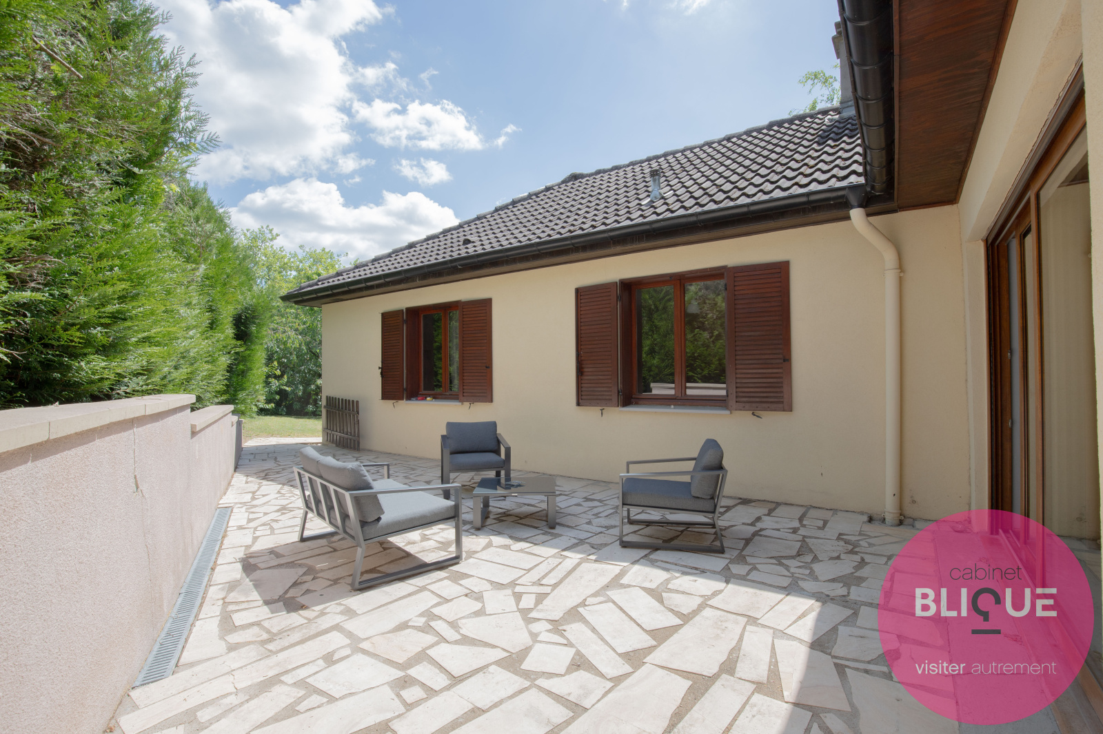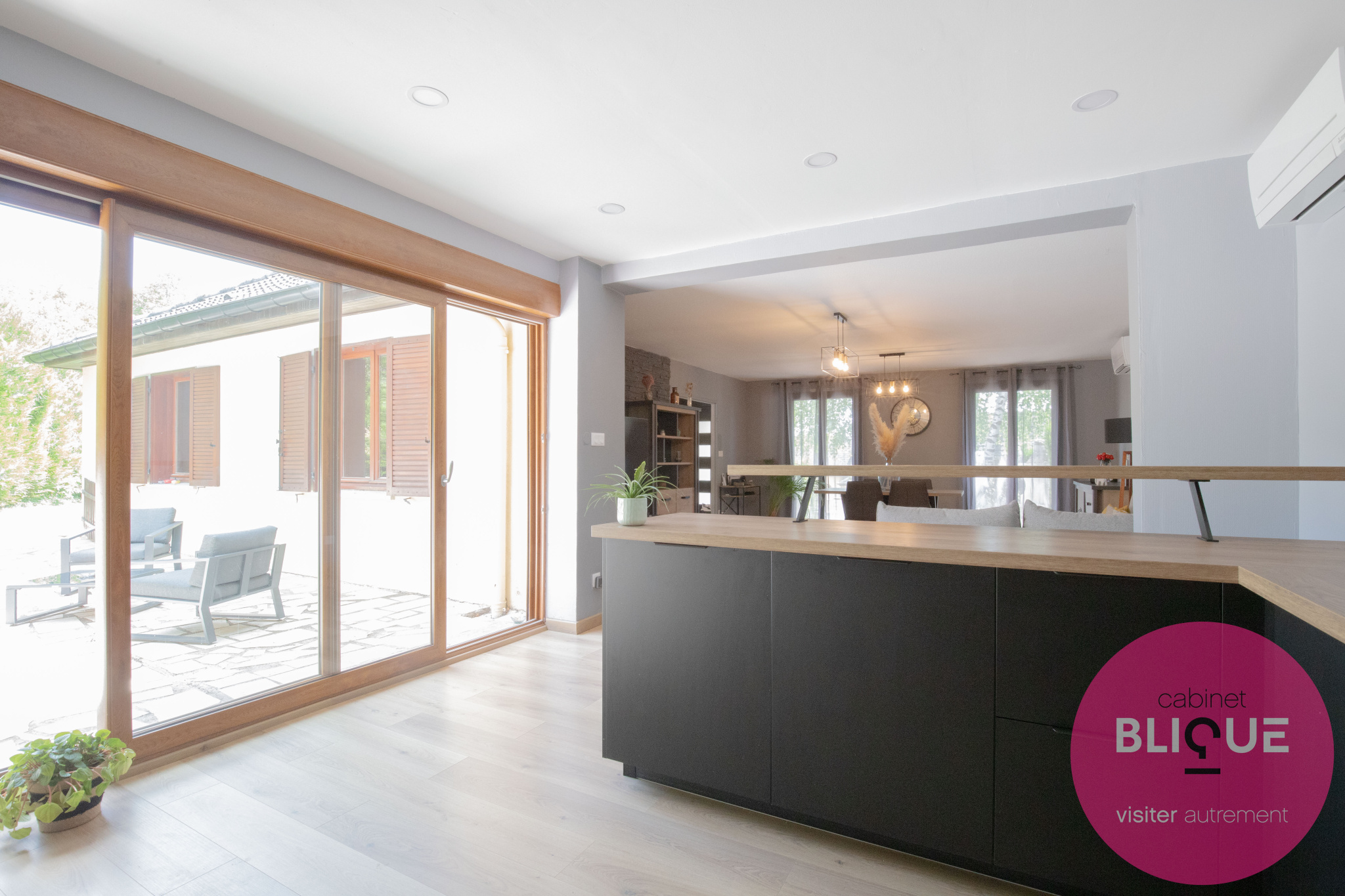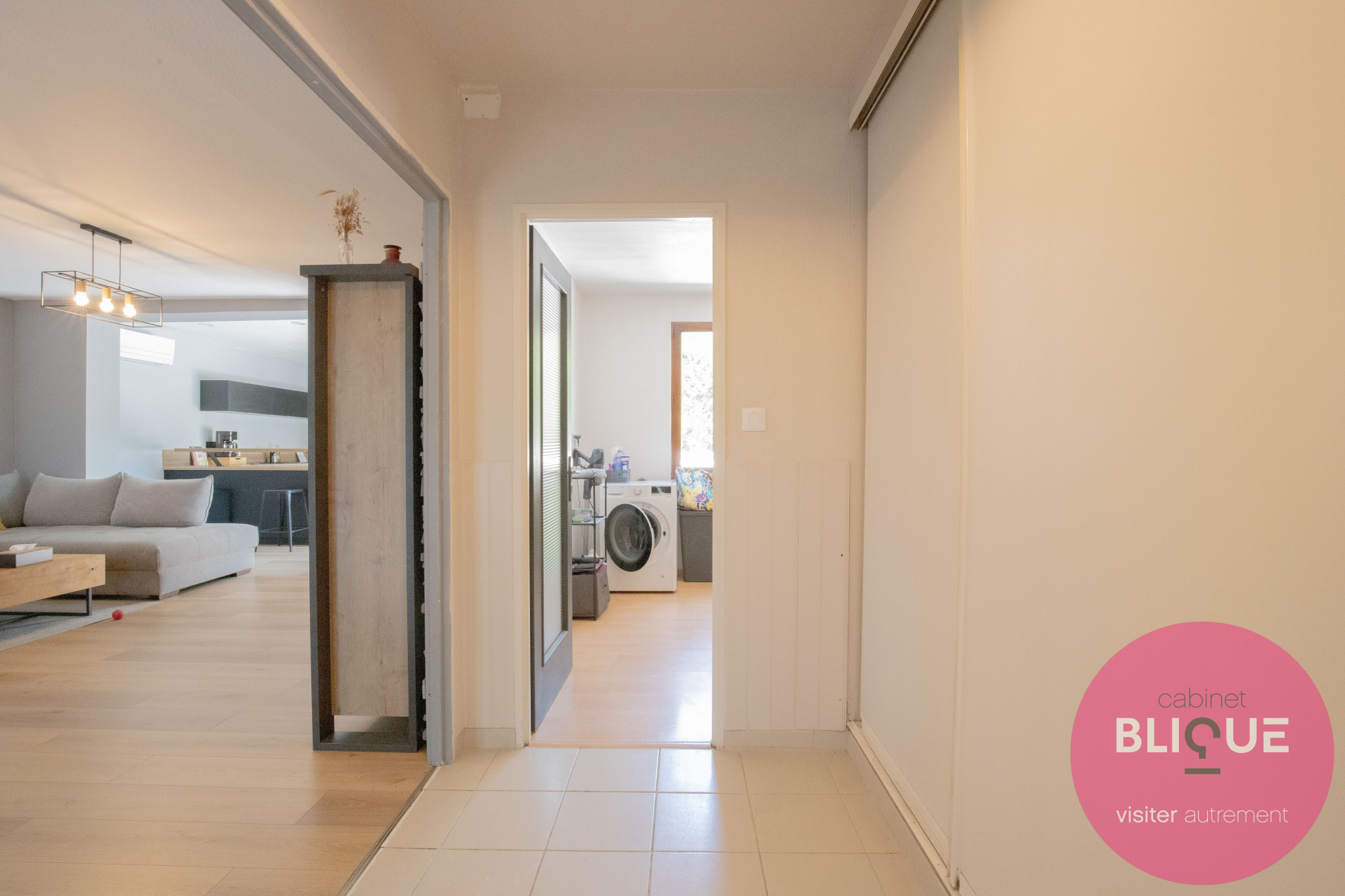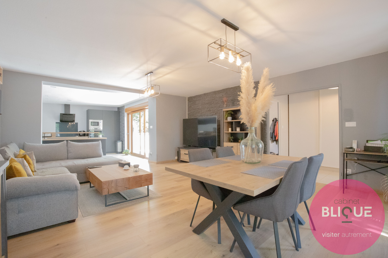 Dès l’entrée avec placard, on découvre une grande pièce de vie de 50 m² baignée de lumière, avec cuisine neuve et accès direct à la terrasse et au jardin. Le tout sur une parcelle de 550 m².