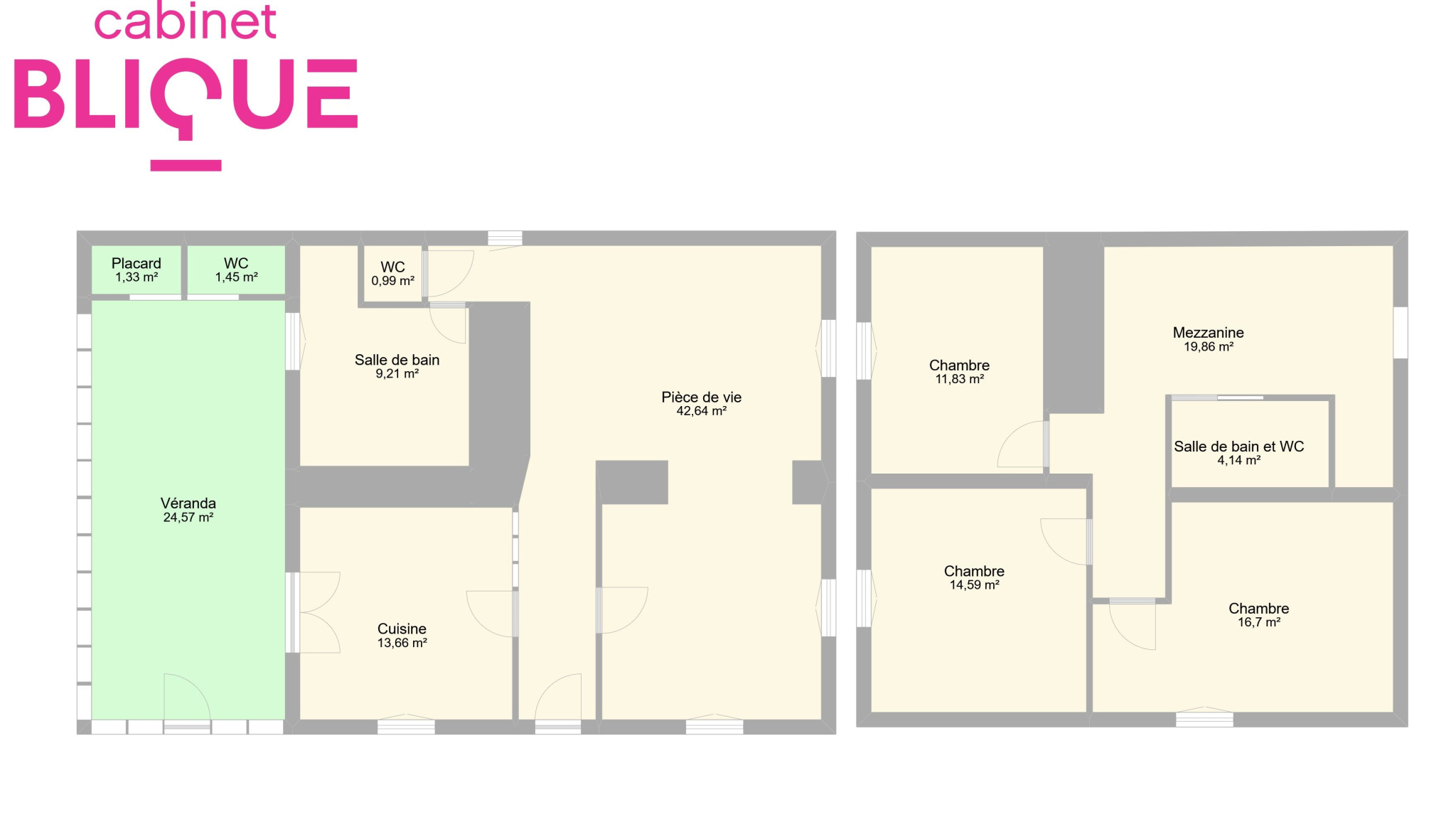 Composée au rez-de-chaussée : d'une pièce de vie de 42,5 m² avec salon et salle à manger, d'une cuisine de 13,5 m² ouverte sur une véranda de 25 m² avec un WC, d'une salle d'eau de 9 m² et d'un second WC séparé.