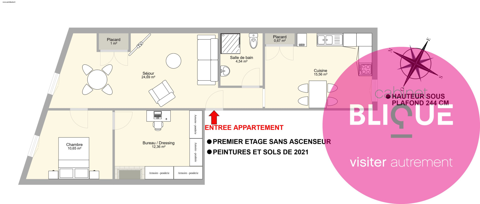 Ce bien se compose d’un séjour avec rangement de 25 m², d’une cuisine de 15 m², d’une salle de bain avec WC de 4.5 m², d’une chambre de 10.5 m² et d’une pièce en enfilade par rapport à la chambre pouvant être utilisée comme bureau, dressing ou chambre d’amis.