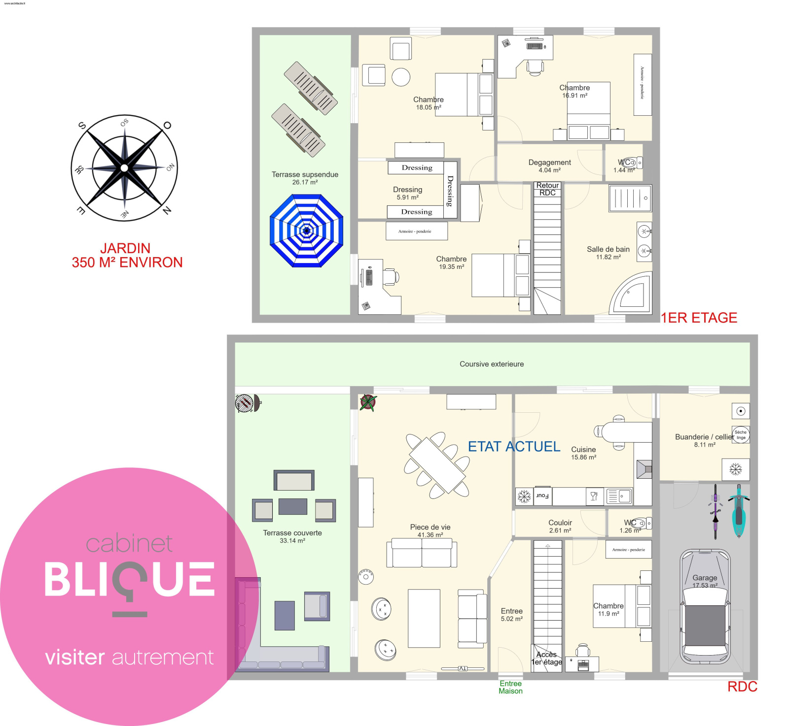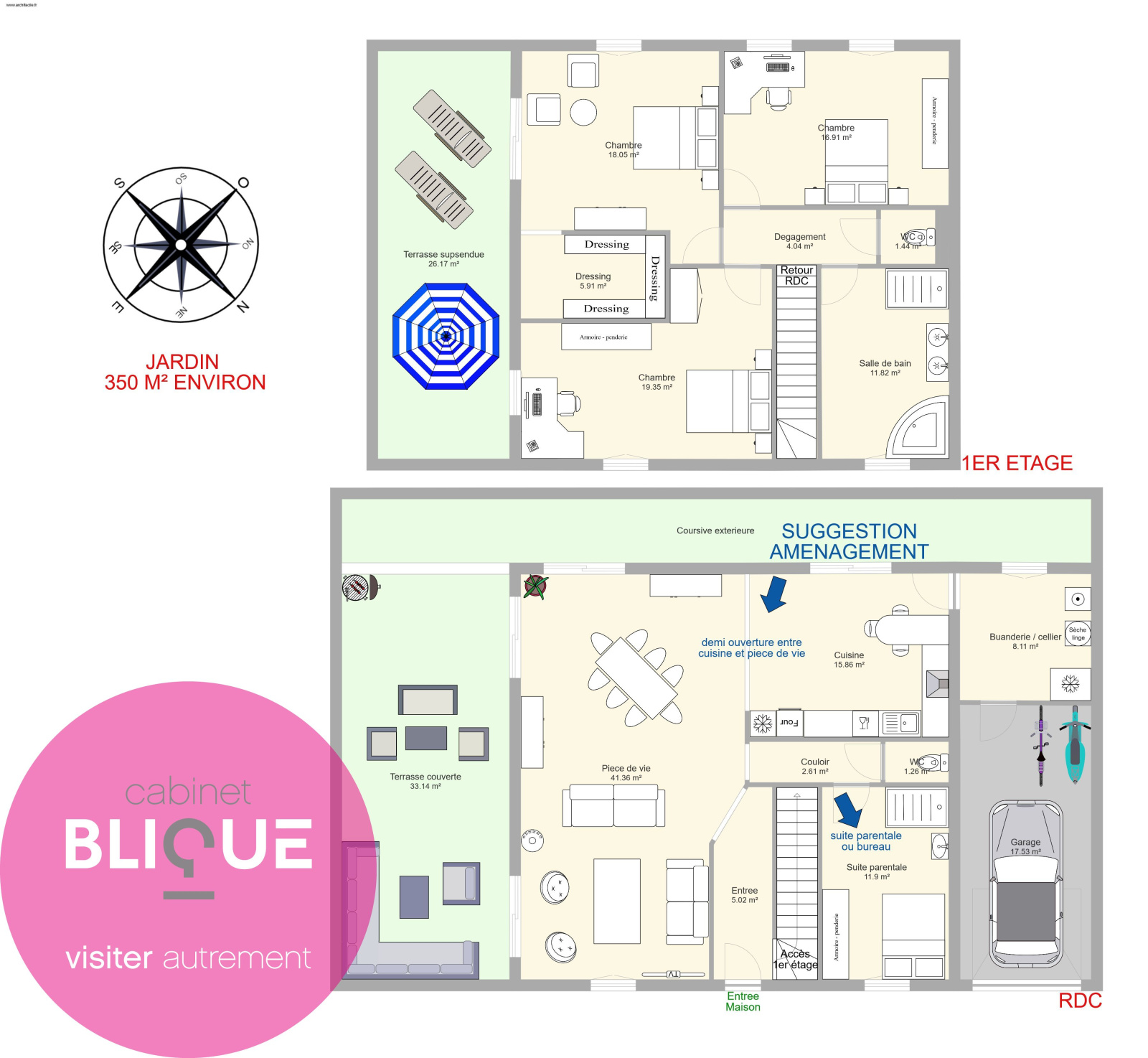 Le reste de la maison va de paire avec la taille des chambres : 46 m² de pièce de vie au RDC avec plusieurs baies vitrées en accès direct vers la terrasse et le jardin paysager réalisé en 2020 de 350 m² environ ; 15 m² de cuisine attenante (possibilité d’ouverture et de création de suite parentale en RDC, voir plan photo N°10). Egalement entre la cuisine et le garage, un cellier / buanderie très pratique. Pour finir, la salle de bain ne vient pas dénoter le reste des volumes avec ses 12 m², double vasque, douche à l’italienne et baignoire d’angle.