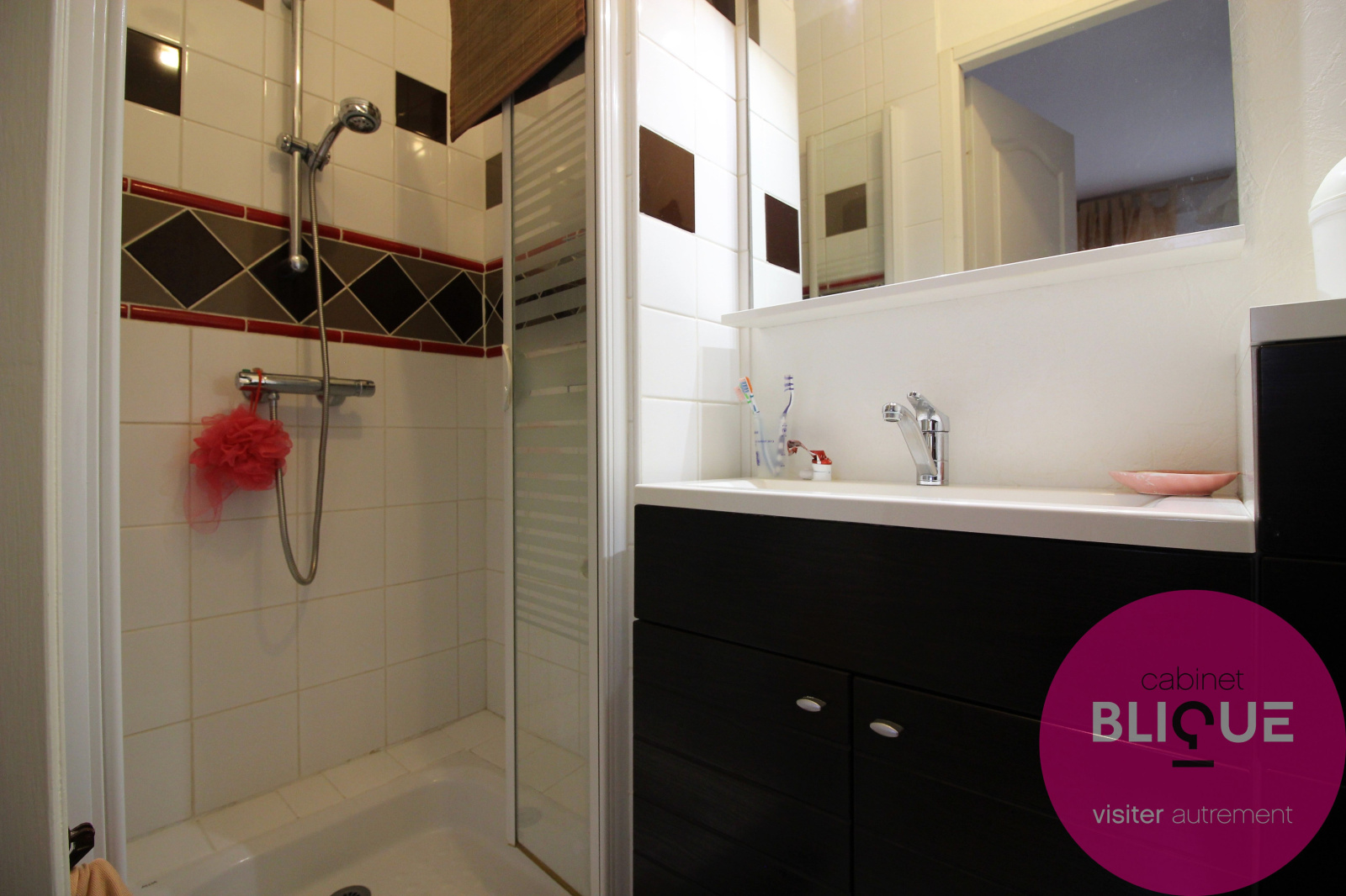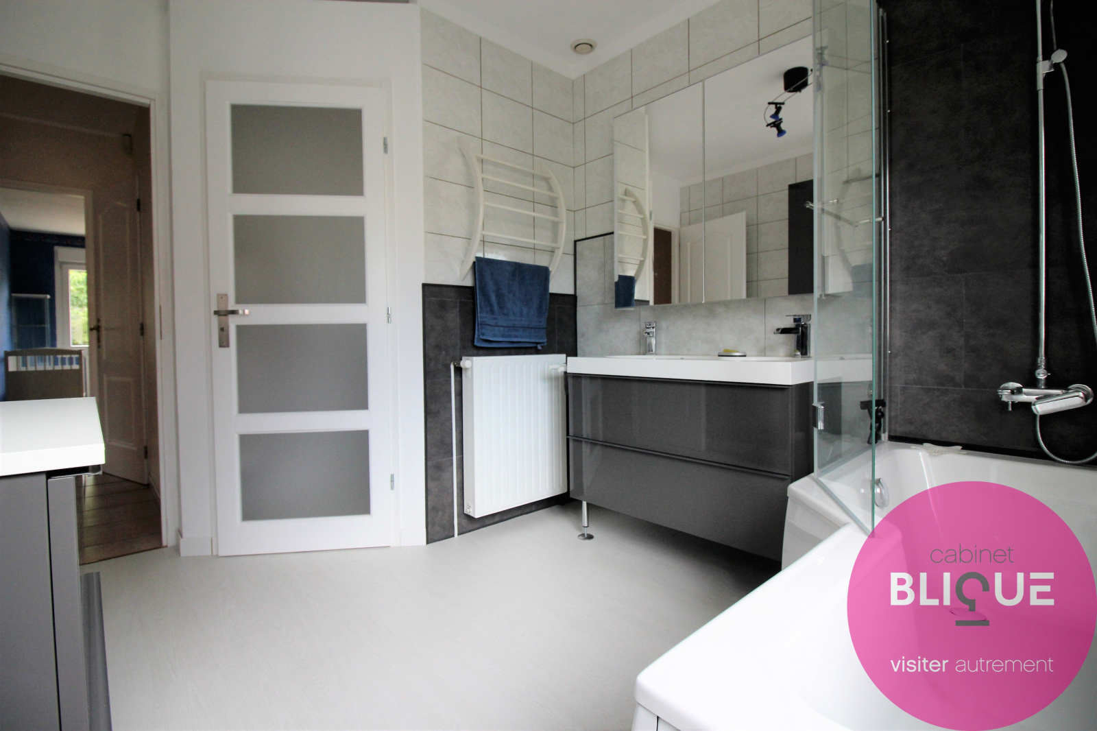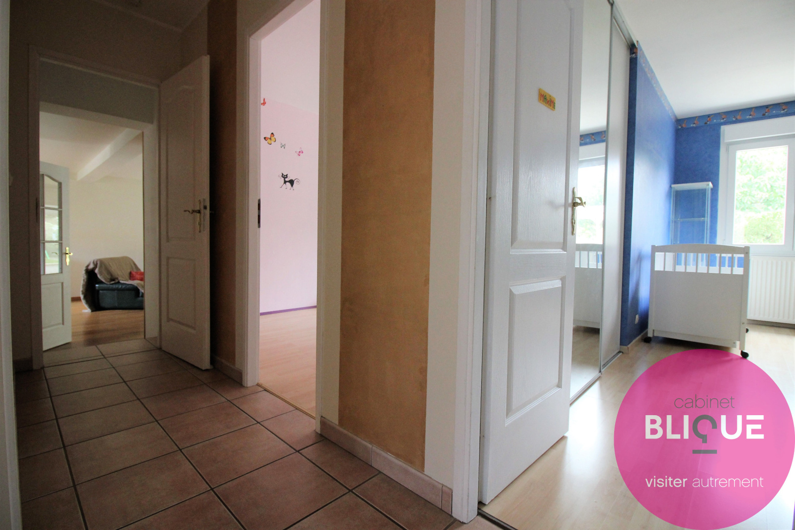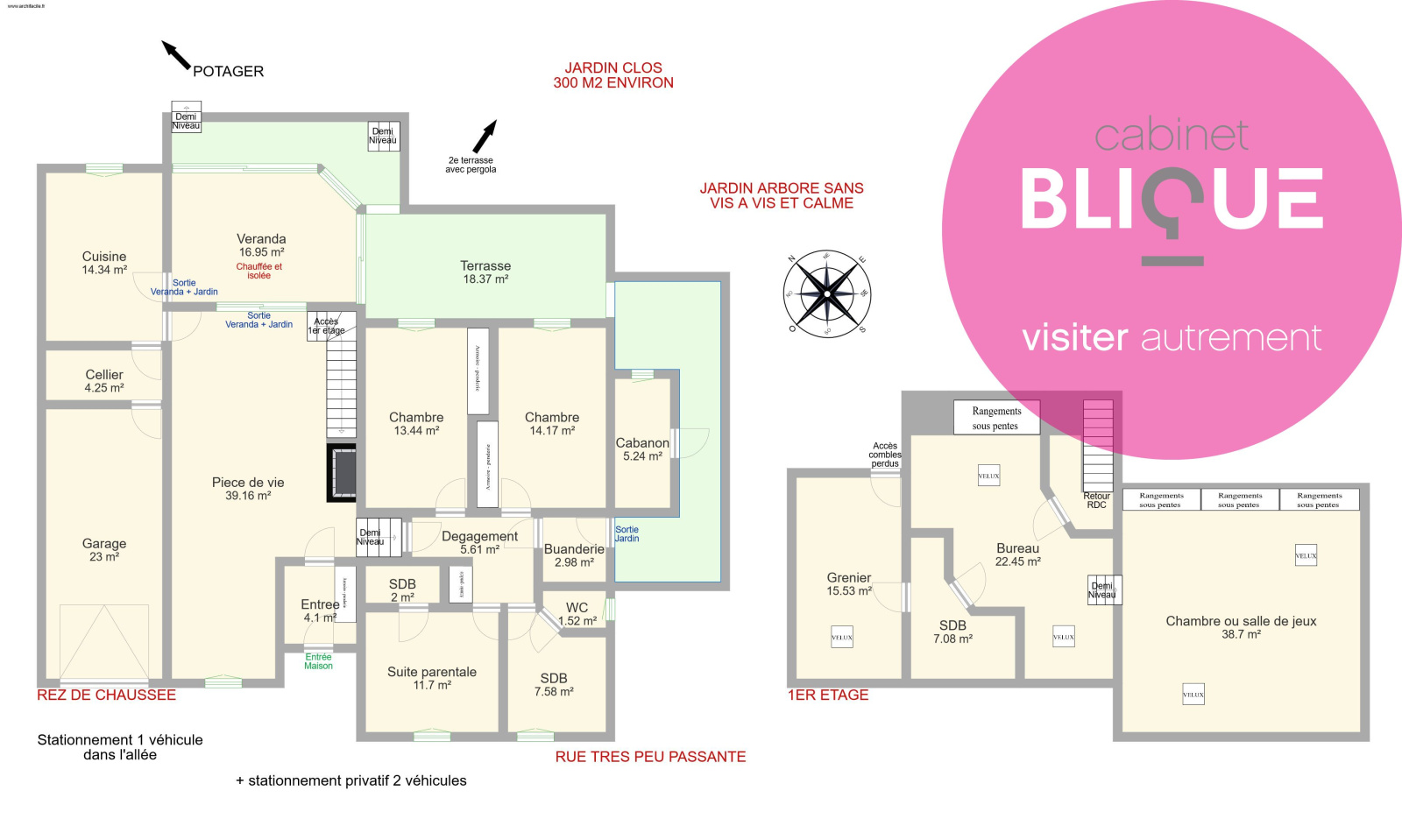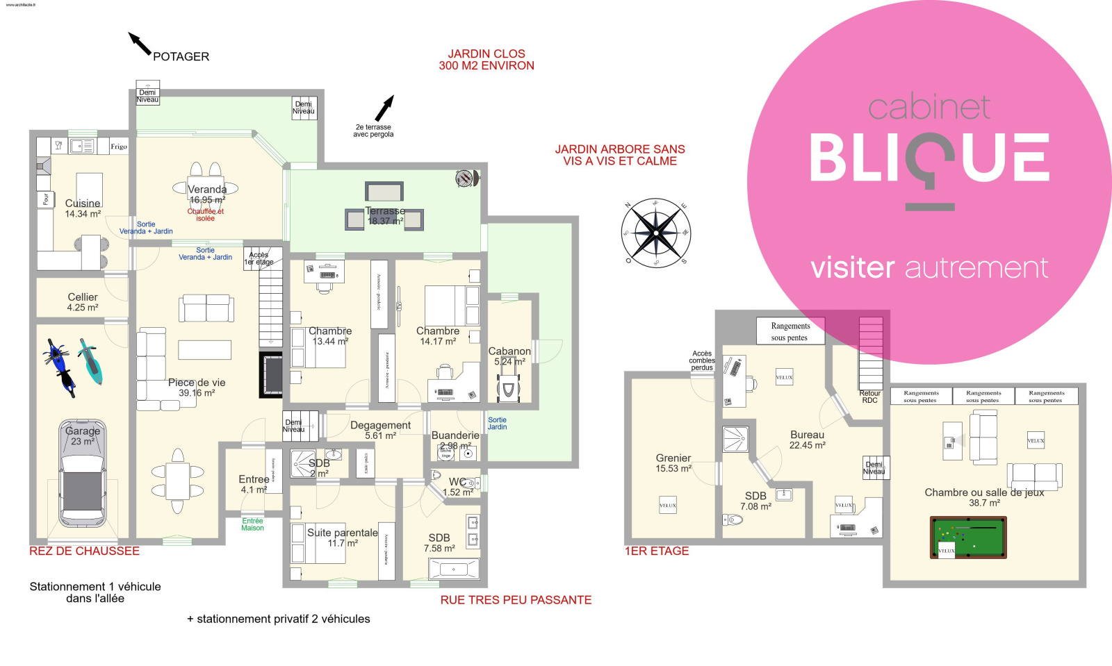 Ensuite sur un demi-niveau, 3 belles chambres de 12, 13 et 14 m² dont deux avec dressing et une avec salle d’eau privative. Egalement une SDB avec WC neuve de 2017 et un espace buanderie indépendant donnant directement sur l’extérieur.
