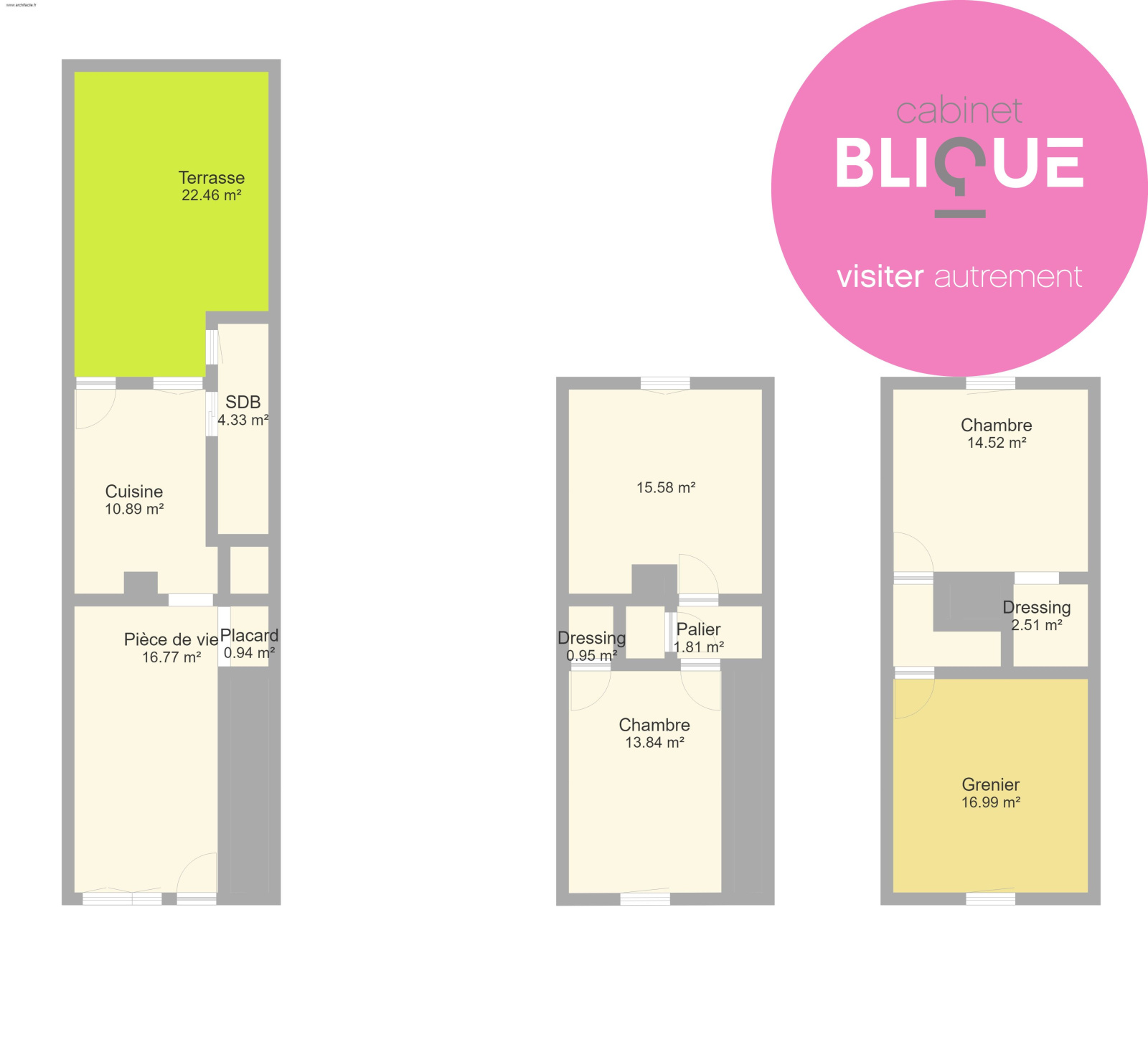 Go Go Gadget au marteau pour agrandir l'habitation et y créer une troisième chambre de 14.5 m² avec son coin dressing de 2.5 m² au deuxième et dernier étage.