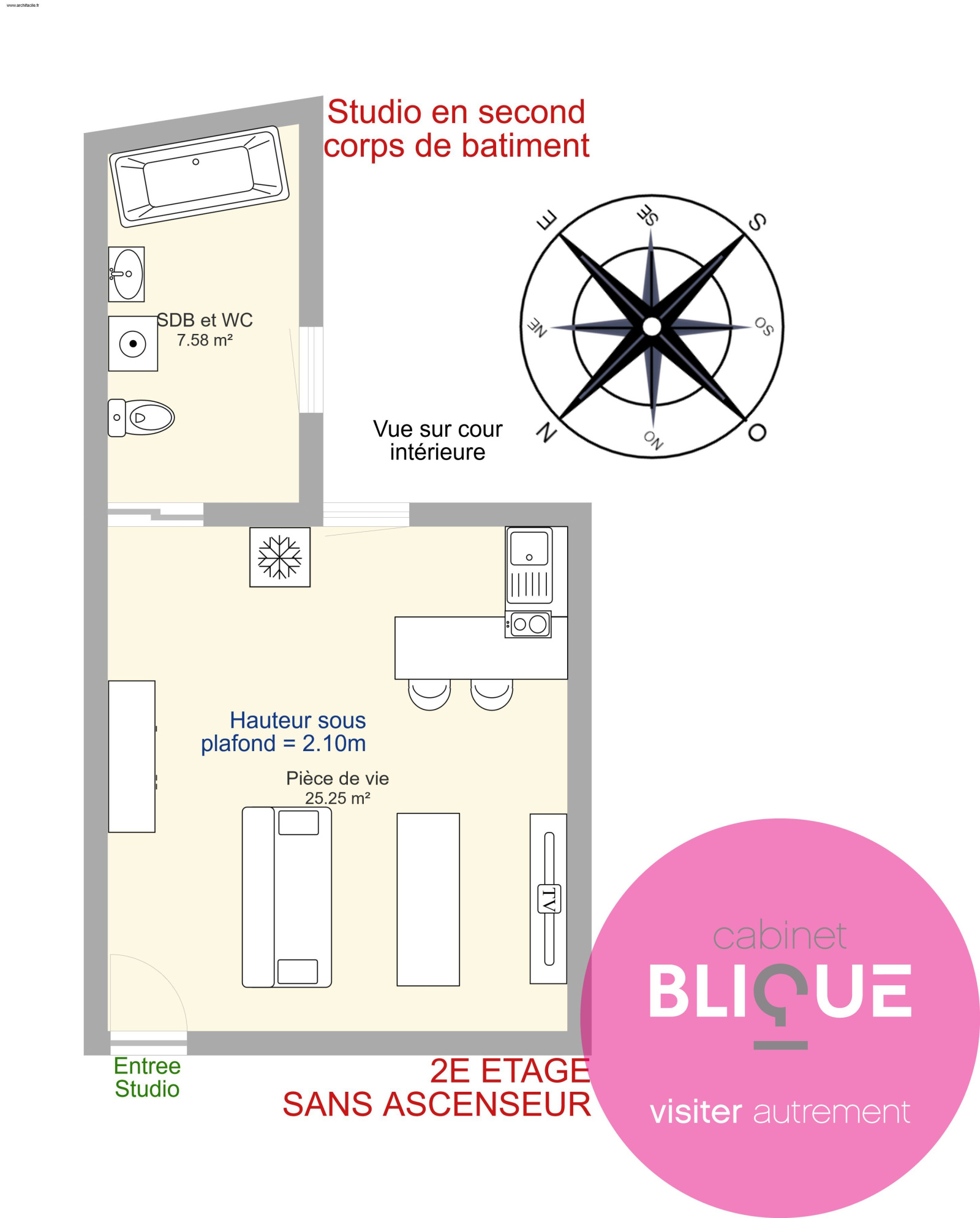 Les fenêtres sont en double vitrage, le tableau électrique a été refait. Chauffage et eau chaude électriques. Kitchenette électrique également. Pas de gaz dans le logement. Salle de bain avec WC, baignoire et emplacement machine à laver.