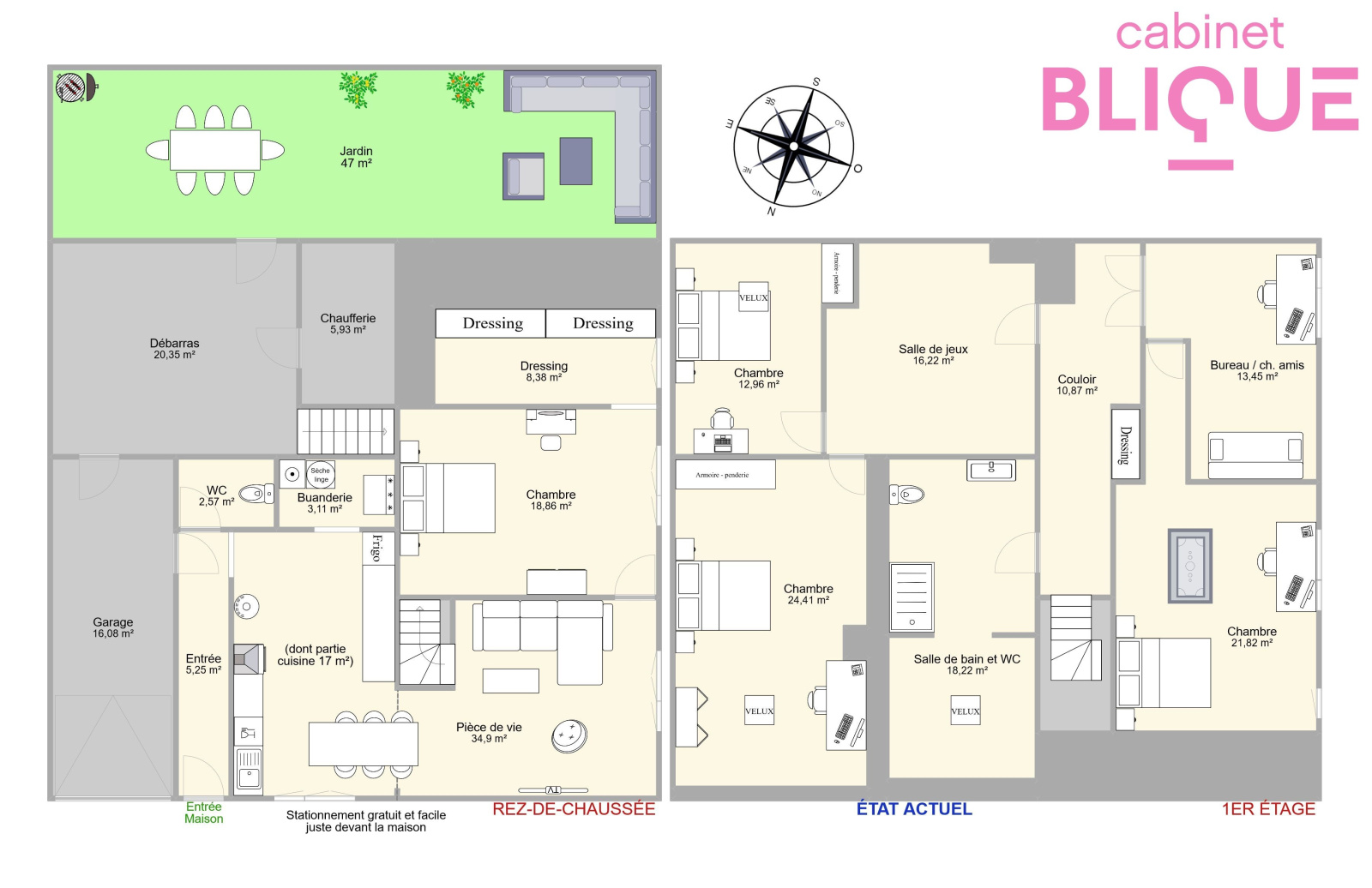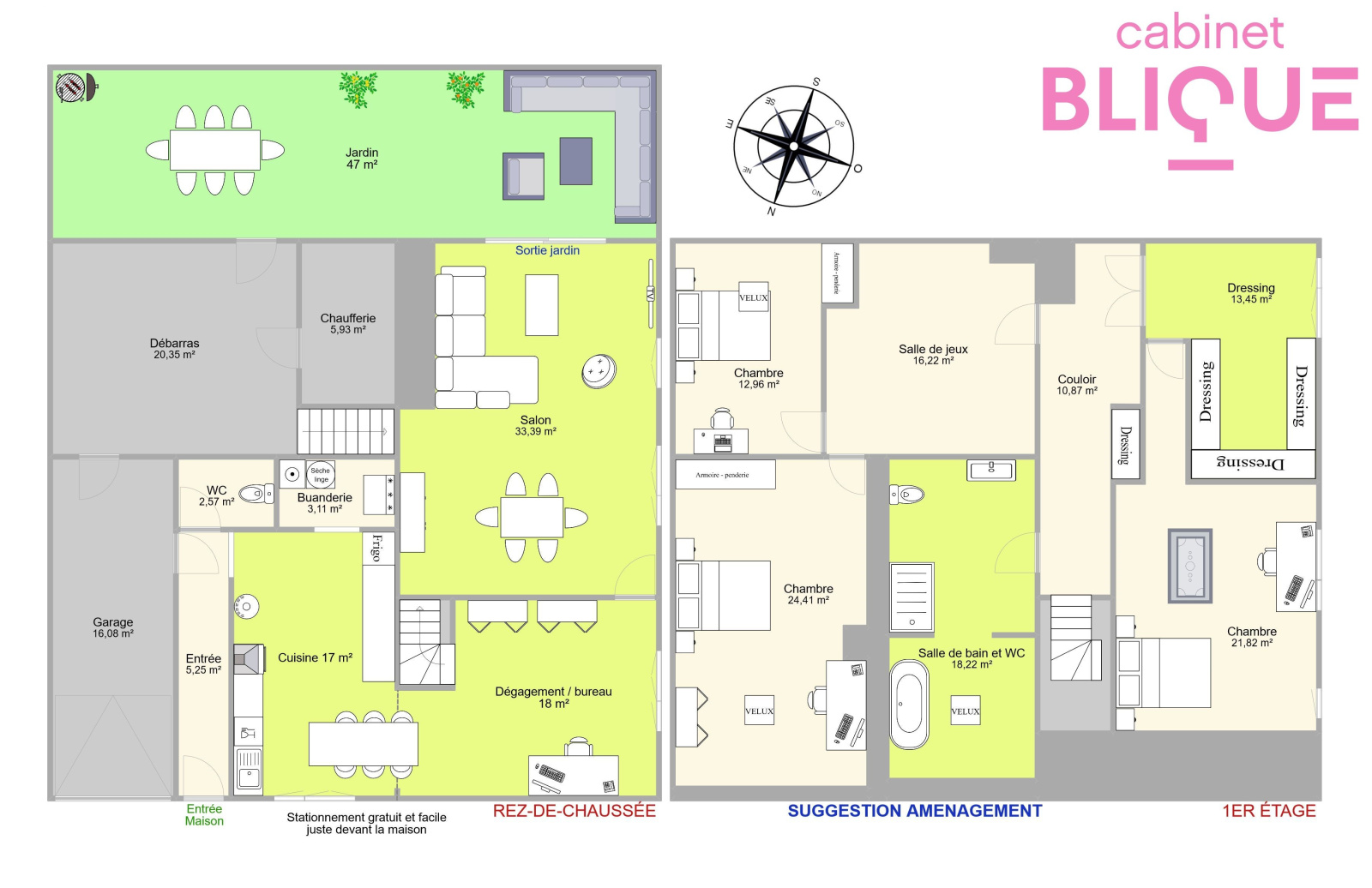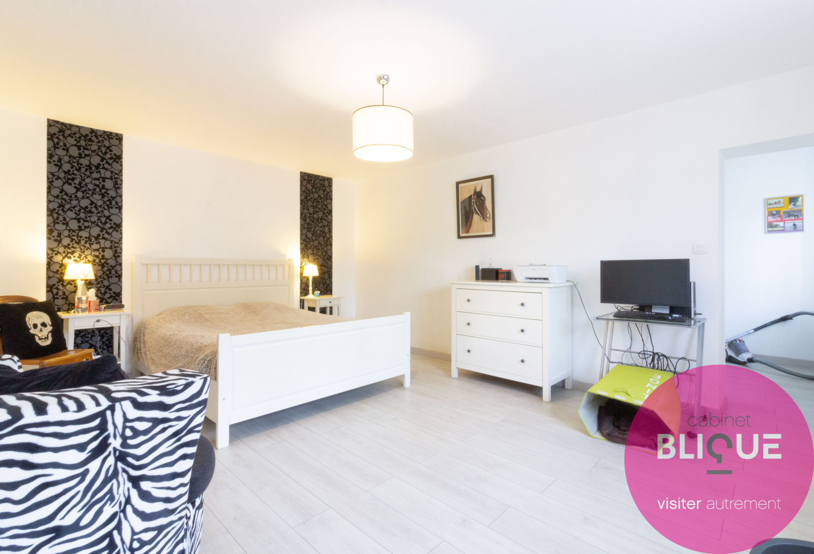 Huuu dada, montres-moi ses volumes généreux : au rez-de-chaussée une pièce de vie de 35 m² avec une cuisine équipée ouverte et un poêle à granulés. Puis derrière une belle pièce de 19 m² actuellement occupée en chambre et dressing, mais qui pourrait faire office de salon, et ainsi offrir 54 m² de pièce de vie. Il faut de la place pour un grand cheval ! (Voir suggestion d’aménagement en photo N°10 et 11). A l’étage, 3 chambres de 13 à 25 m² ainsi que deux pièces pouvant faire office de bureaux ou salles de jeux (diverses possibilités à découvrir en plans également). Ainsi qu’une très grande salle de bain pour soigner sa pouliche. 1 WC par niveau.