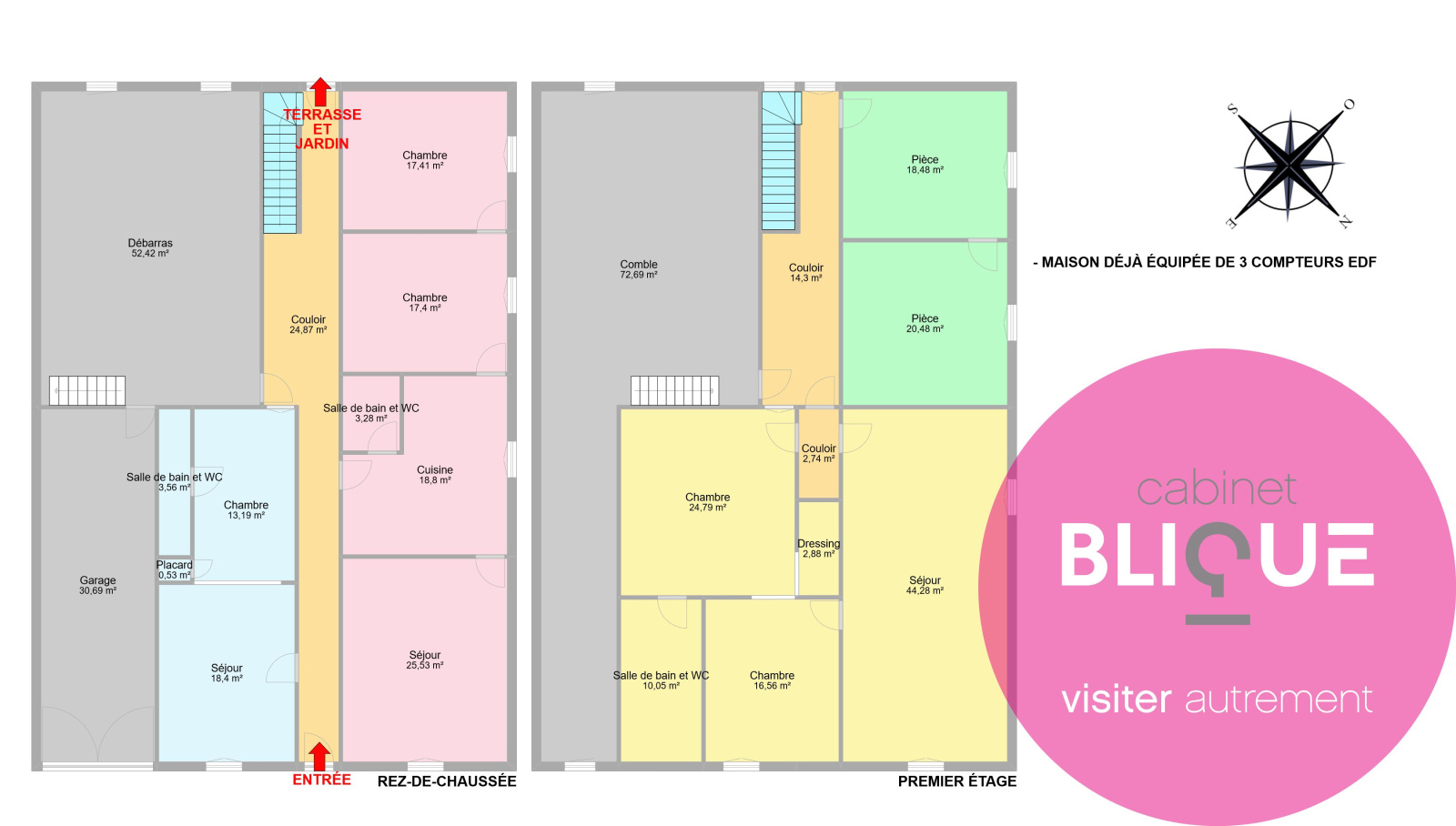 – un rez-de-chaussée avec garage de 30 m², débarras de 52 m² (qui n’attend qu’un coup de baguette magique), un F2 de 35 m², un F3 de 82 m² et un jardin de 100 m² avec option parkings.