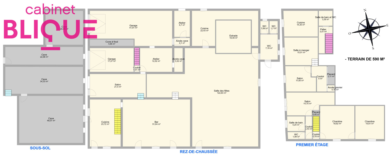 Au premier étage : Un appartement prêt à être loué de 110 m² environ composé de deux chambres de 18.5 et 15.5 m², une salle de bain de 4.5 m² et une salle d’eau avec WC de 3.5 m², une cuisine de 14 m², deux salons de 11.5 et 14.5 m² de nombreux rangements et un WC séparé.