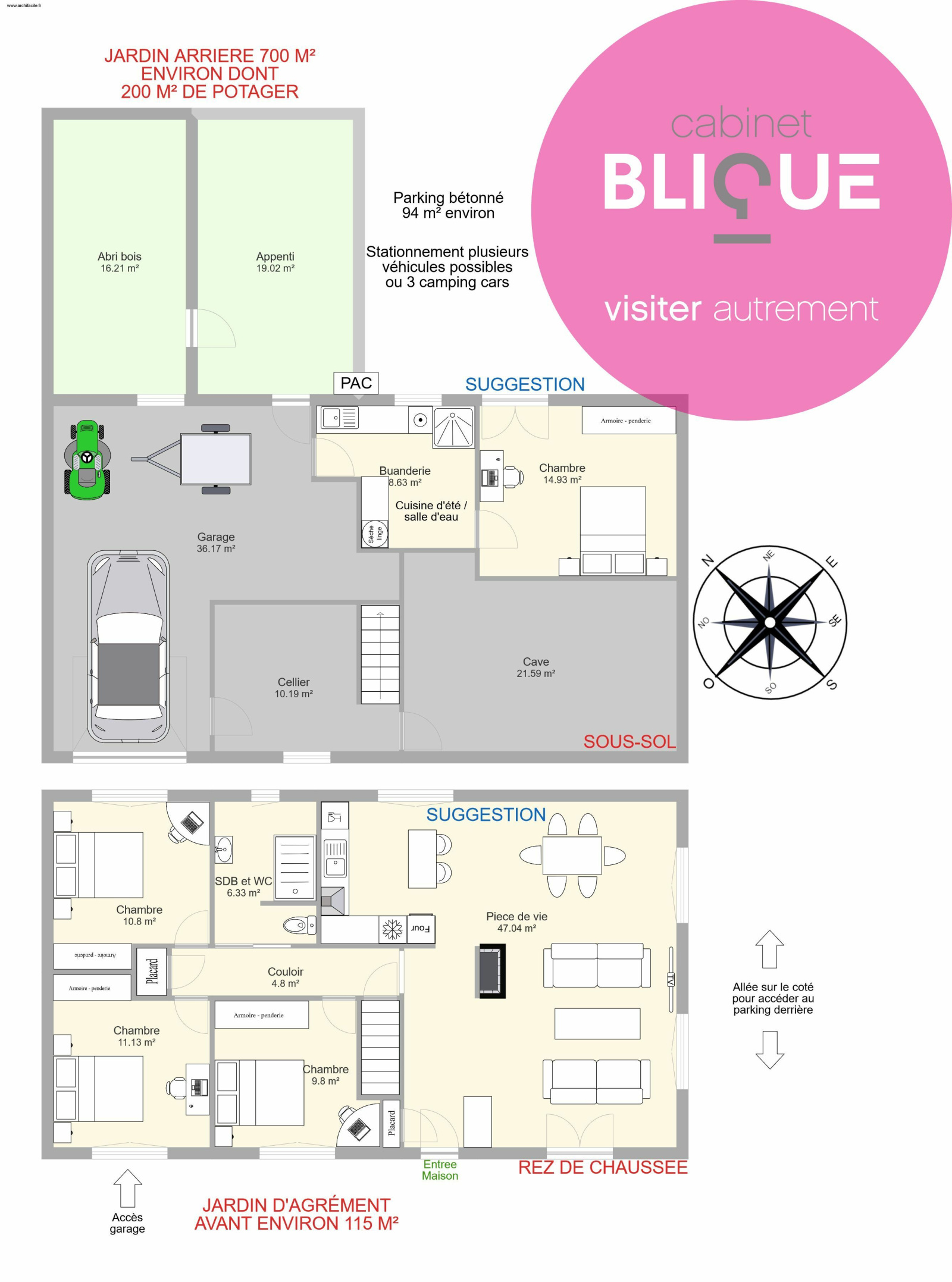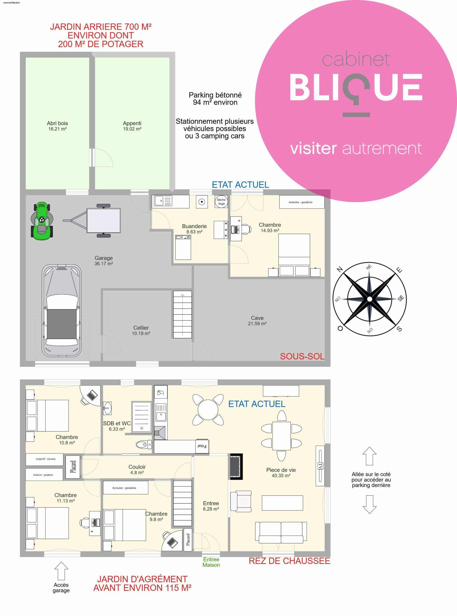 ATOUT MAJEUR elle est édifiée sur un sous sol complet avec garage de 36 m², cellier, cave de 22 m², buanderie / cuisine d’été et une chambre à conforter en accès direct sur le jardin, idéal pour un adolescent ou se faire un bureau séparé du reste de l’habitation. En effet le reste se situe à l’étage (en accès plain pied par la rue), l'entrée dessert la pièce de vie de 40 m² avec cuisine ouverte et cheminée, puis salle de bain avec WC (adaptés PMR), et 3 chambres de 10, 11 et 11 m² (voir plans photos N°9 et suggestion aménagement photo N°10).