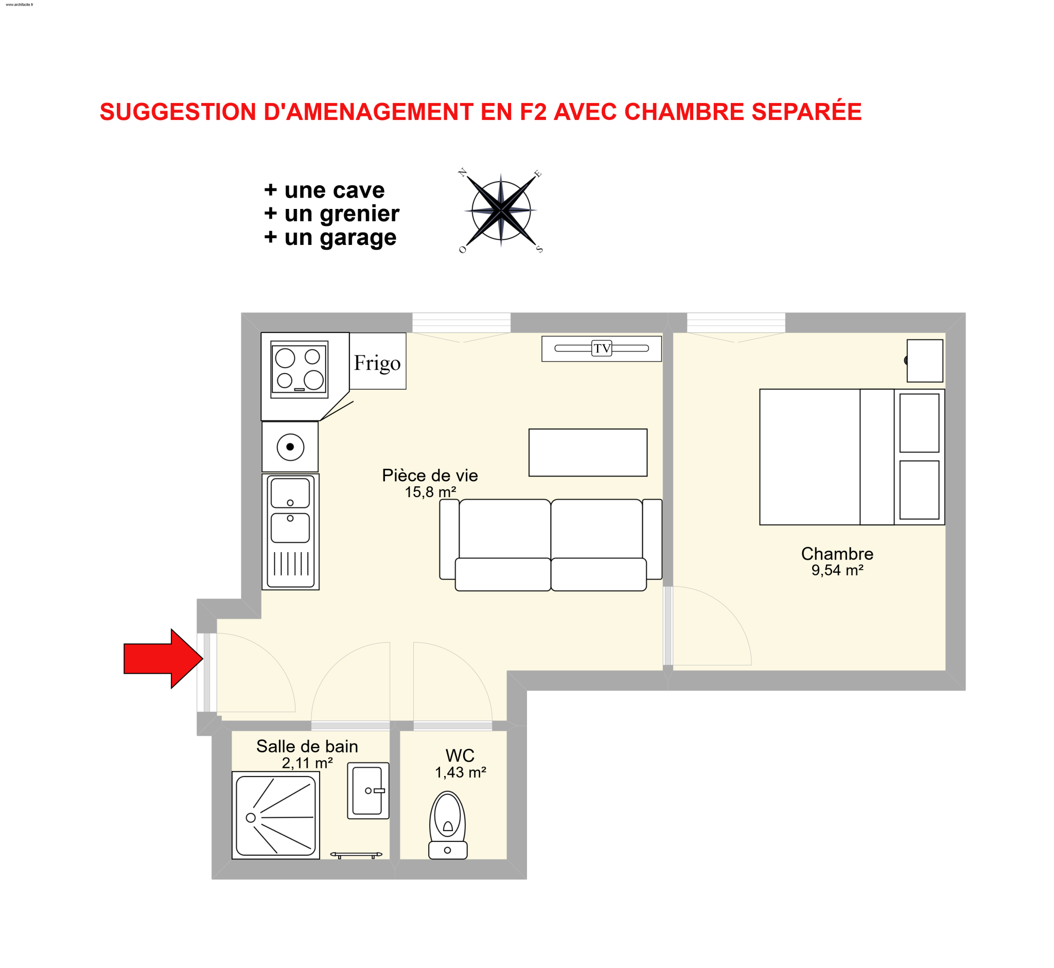 Possibilité de transformer l'appartement en F2 avec une chambre séparée en décalant la cloison (voir plan en photo N°11).