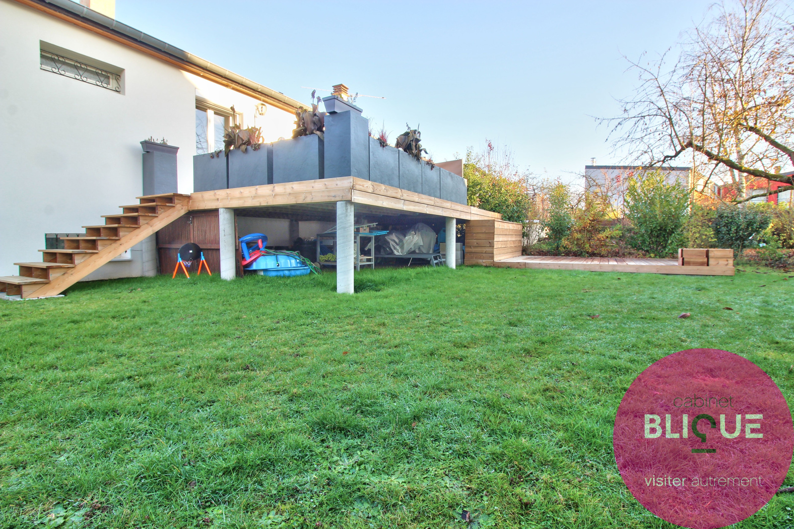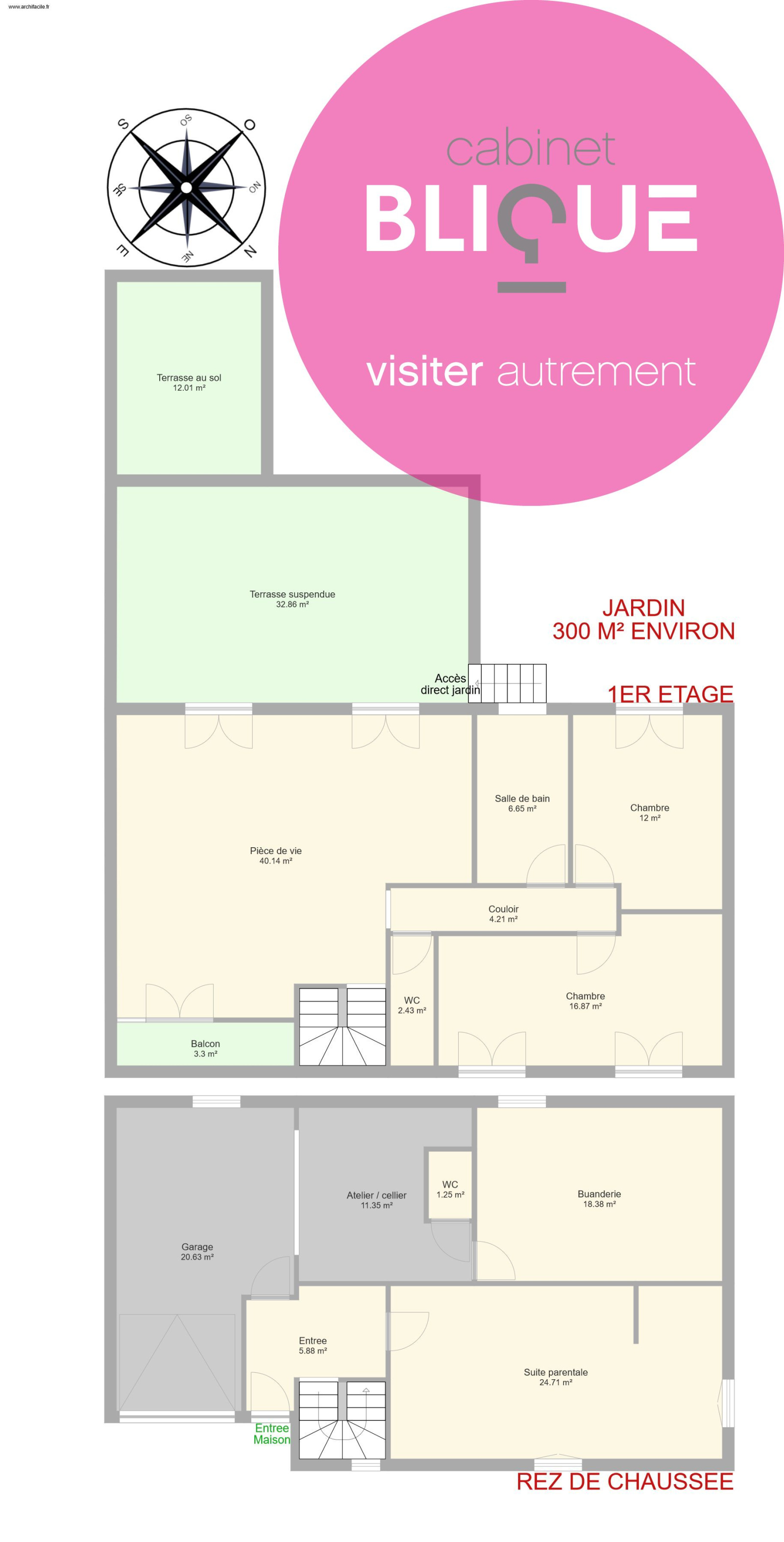 Au RDC vous disposerez d’une entrée desservant une grande suite parentale de 25 m². Egalement garage, atelier, WC et grande buanderie. A l’étage, une belle pièce de vie de 40 m² avec cuisine ouverte et une terrasse suspendue bien exposée de 30 m² donnant accès direct sur le jardin de 300 m² environ. Complètent le niveau un WC, une salle de bain avec douche à l’italienne, et deux chambres : 12 m² et 17 m² pour la seconde avec grand dressing indépendant.
