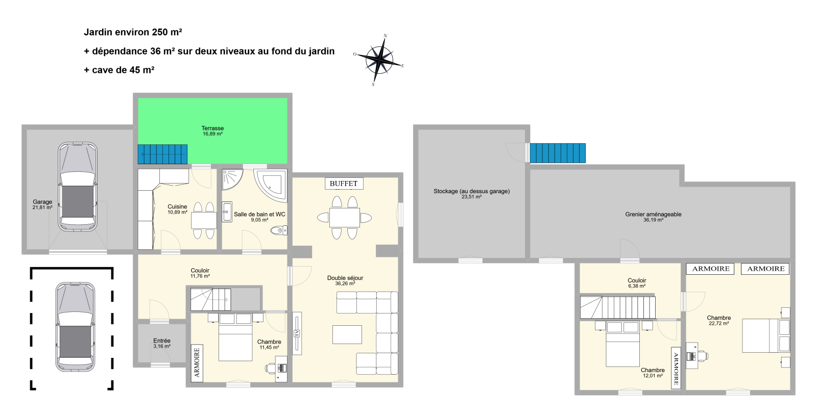 Cerise sur le terrain : un garage avec grenier au-dessus, une cave de 45 m² pour vos grands crus (ou vos cartons), et une dépendance sur deux niveaux qui pourrait bien devenir un atelier, un bureau, un mini-logement ou… ce que vous voulez en fait.
