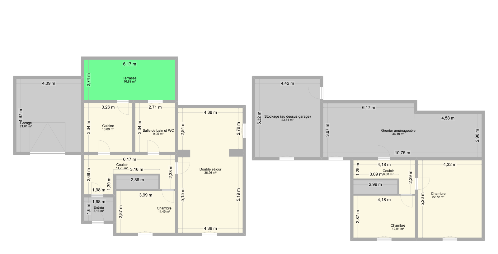 À l’étage, deux chambres (12 et 22 m²) et un grenier de 36 m² prêts à devenir ce que vous voulez : suite parentale, salle de ciné, studio de yoga… laissez parler votre imagination.