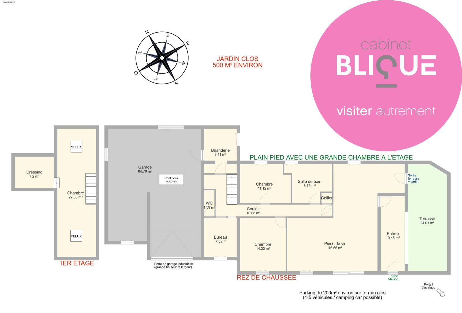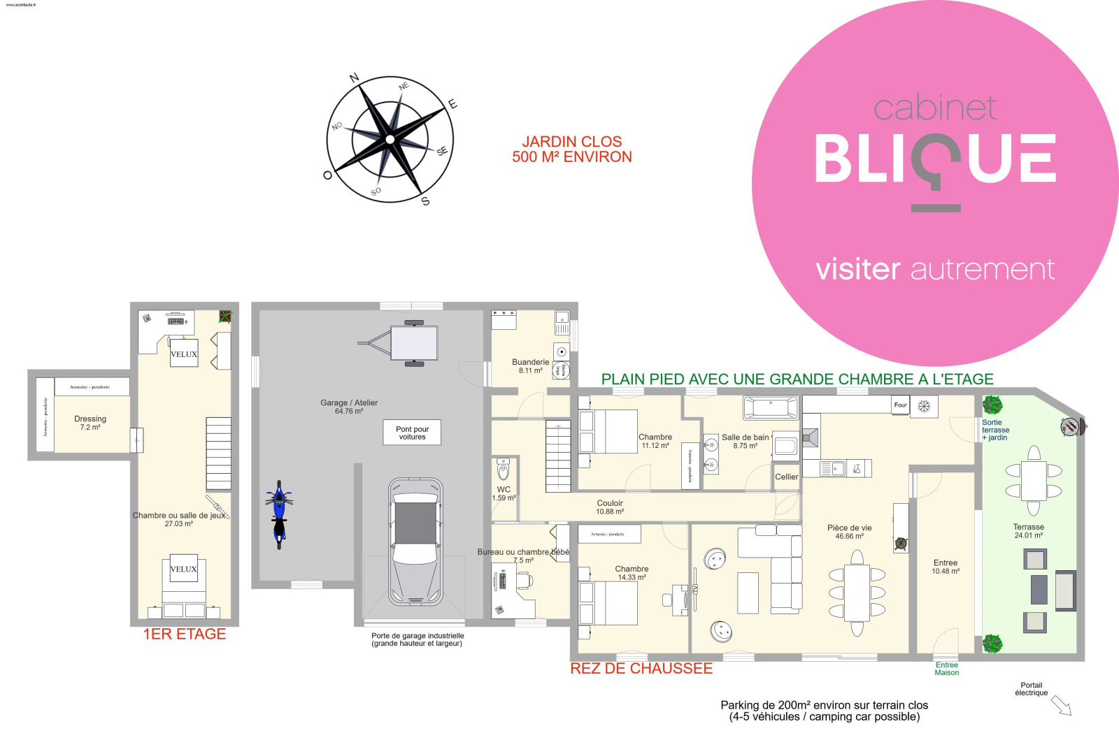 Ca va déraper sans accro dans la pièce de vie de 47 m² avec cuisine ouverte semi-équipée qui permet par ses portes vitrées de rejoindre facilement la terrasse attenante de 24 m². Puis plein gaz sur les deux chambres de 11 et 14 m² avec dressings intégrés, et le bureau (ou chambre bébé). Salle de bain avec double vasque, WC séparé, buanderie indépendante. Mais c’est un plain pied qui en a sous la pédale car à l’étage a été aménagée en 2020 une troisième grande chambre de 27 m² avec un dressing attenant. Pour l’arrêt aux stands, un vrai garage de 65 m² environ avec une porte industrielle (grande largeur grande hauteur) et un pont pour voitures (à négocier). Avis aux mécanos !