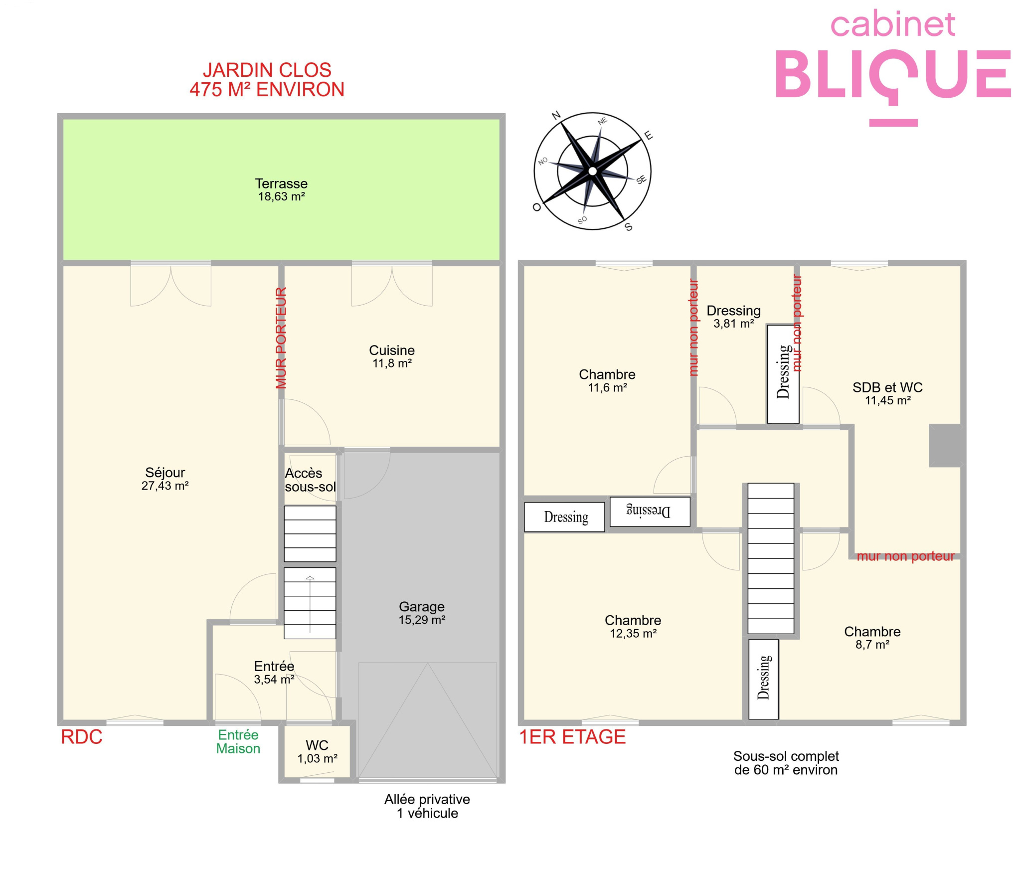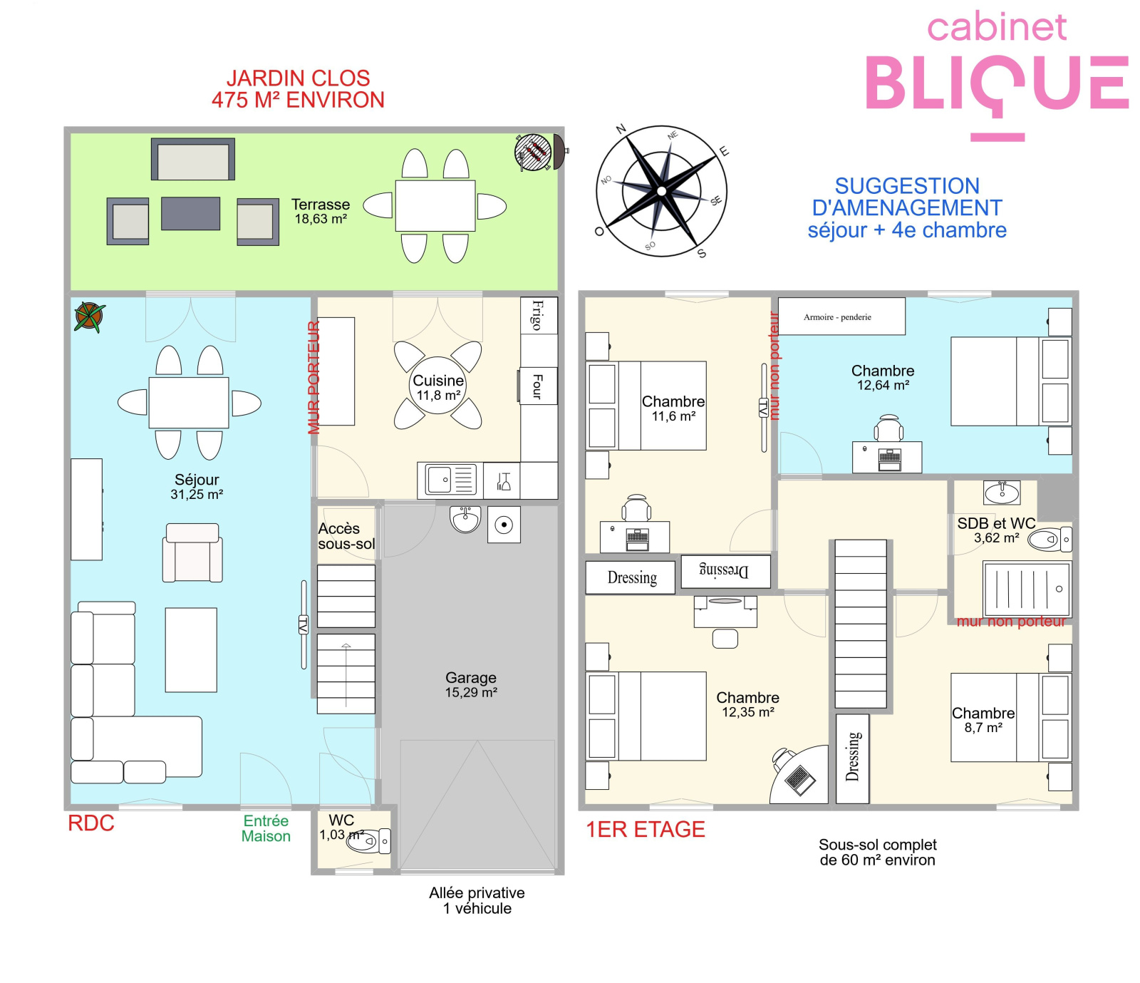À l’étage, 3 chambres, un dressing et une grande salle de bains avec la possibilité de recréer une 4ème chambre si la famille s’agrandit ou si le télétravail devient envahissant (voir plans photos N°10 et 11).