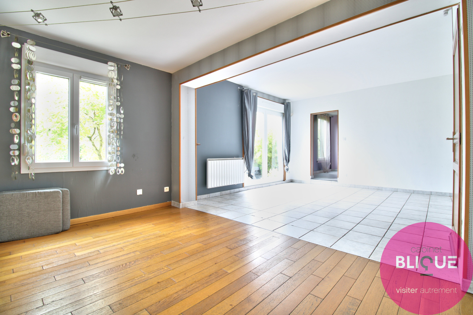 Rue Voltaire, maison individuelle de 139 m² avec cinq chambres, deux jardins, deux terrasses, garage, cave.