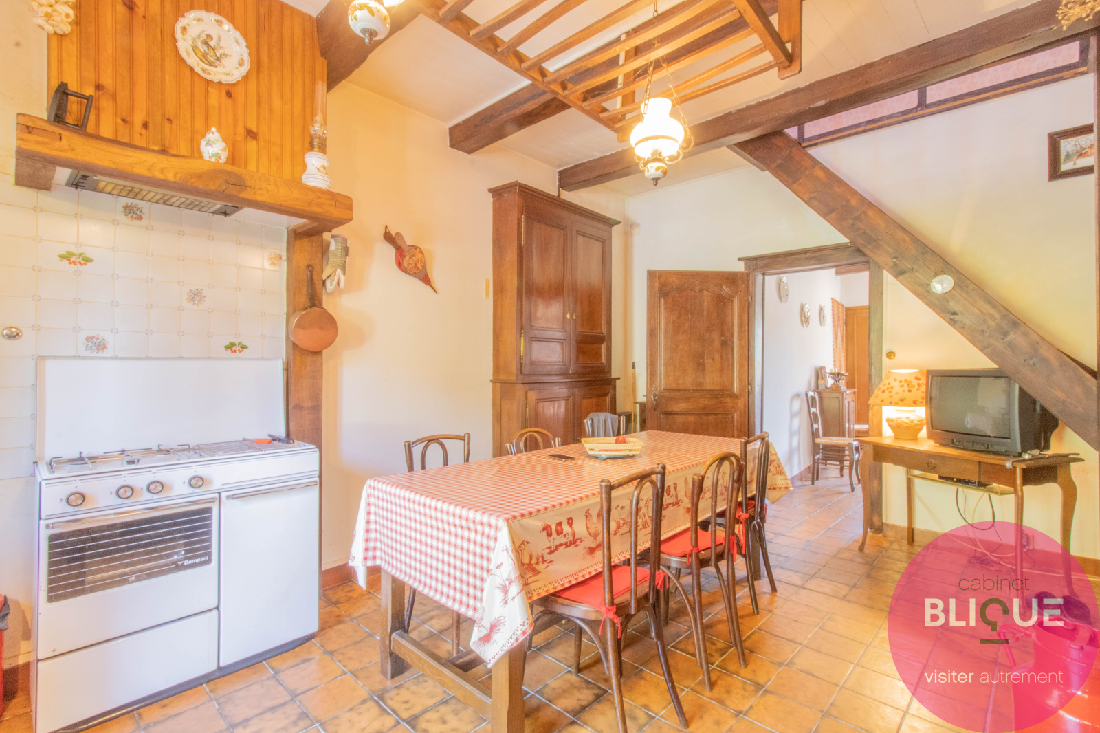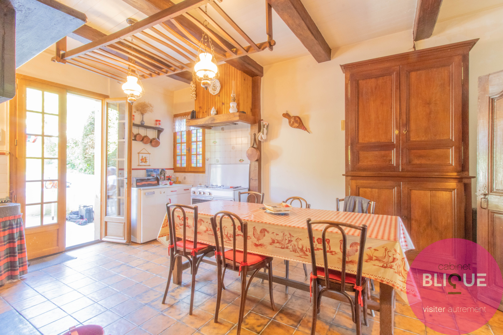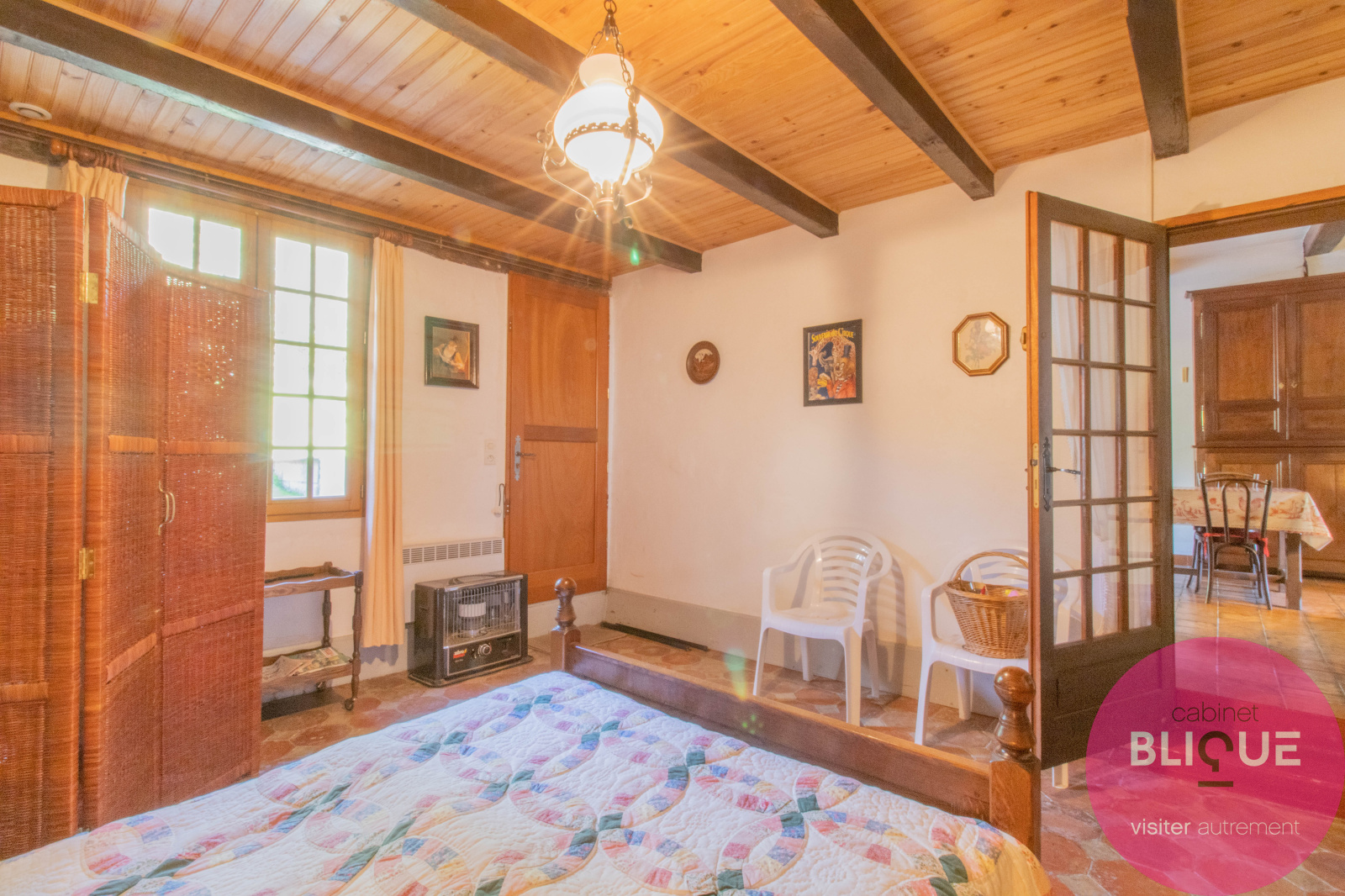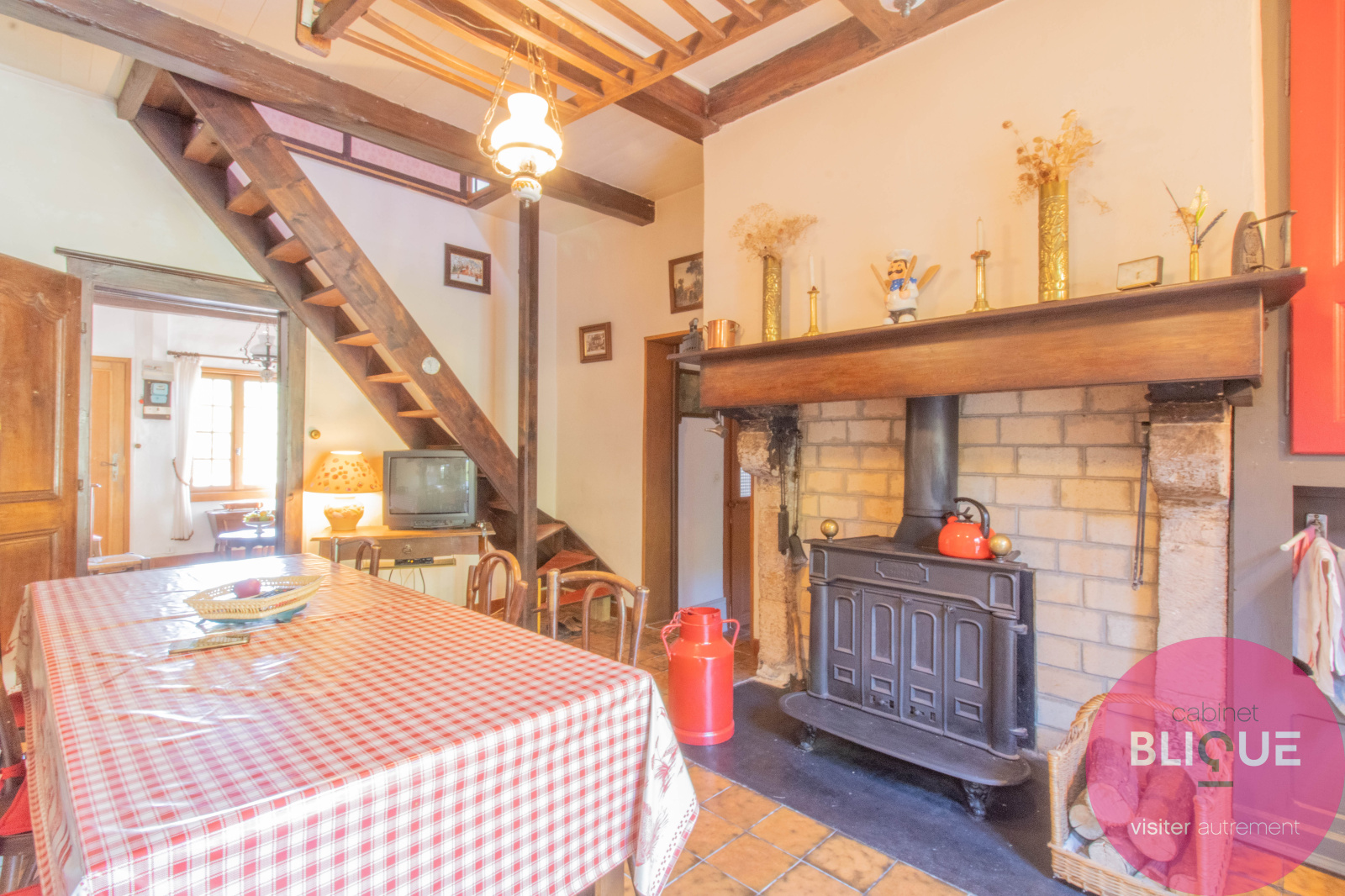 A l'intérieur, il dispose, au rez-de-chaussée, d'un salon de 12 m², d'une cuisine de 19 m² avec accès direct à la terrasse, et une chambre de 18 m². Une salle à manger avec cheminée en pierre est à rénover.