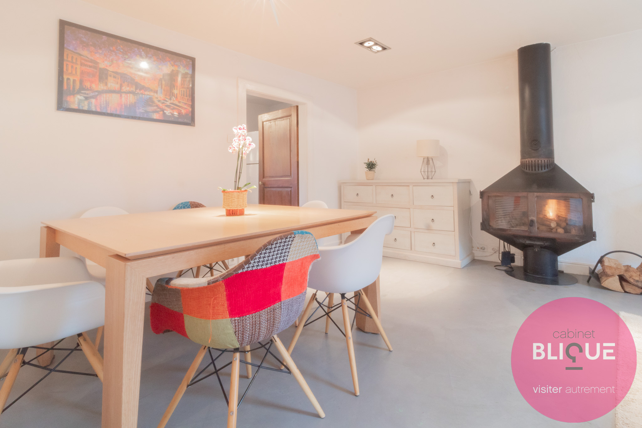 Le salon se réchauffe au rythme de l’insert à bois, et pour les hivers les plus sérieux, la chaufferie avec chaudière à granulés fait le job.