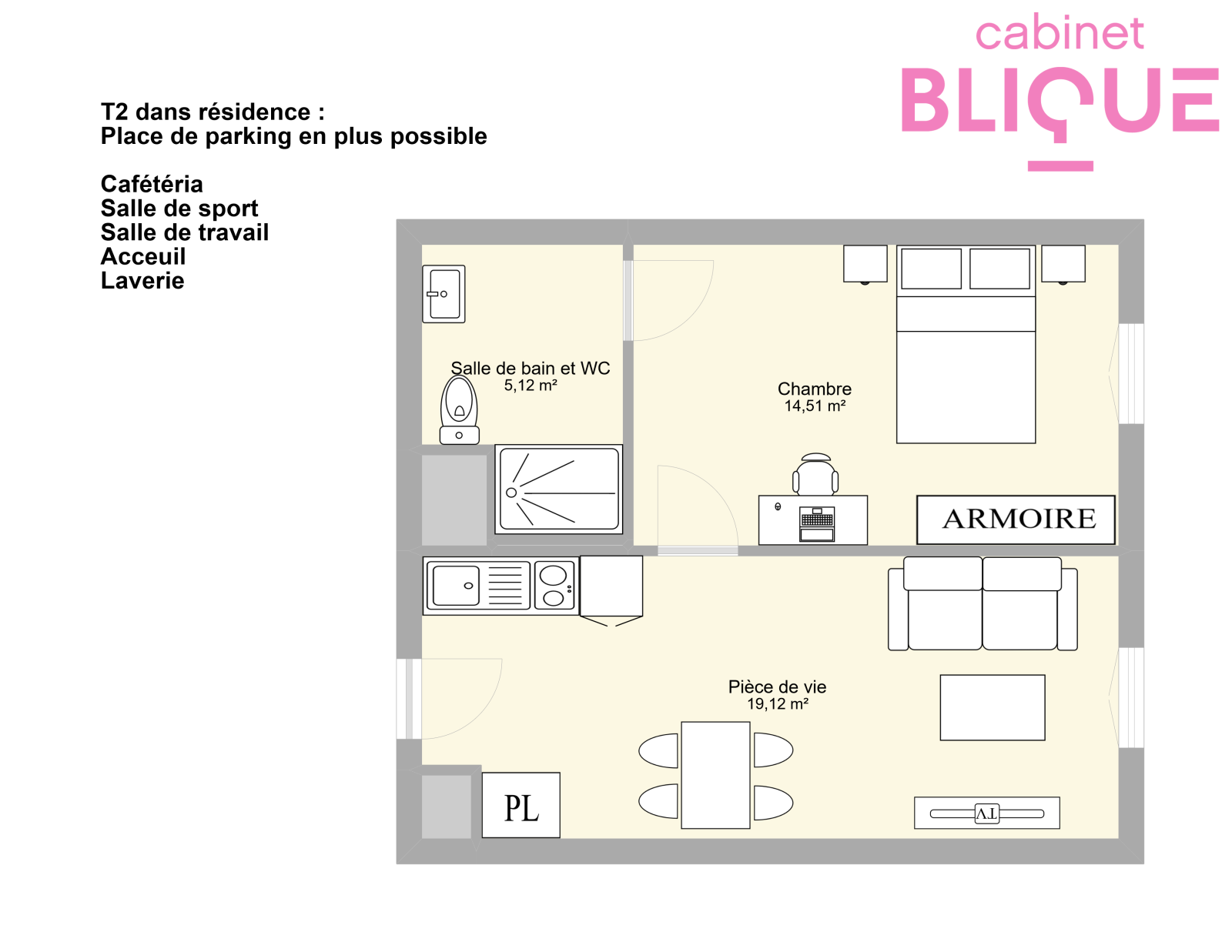 Des espaces communs pour les résidents : accueil, espace détente, cafétéria, salle de travail, salle de sport, laverie et local vélos.
