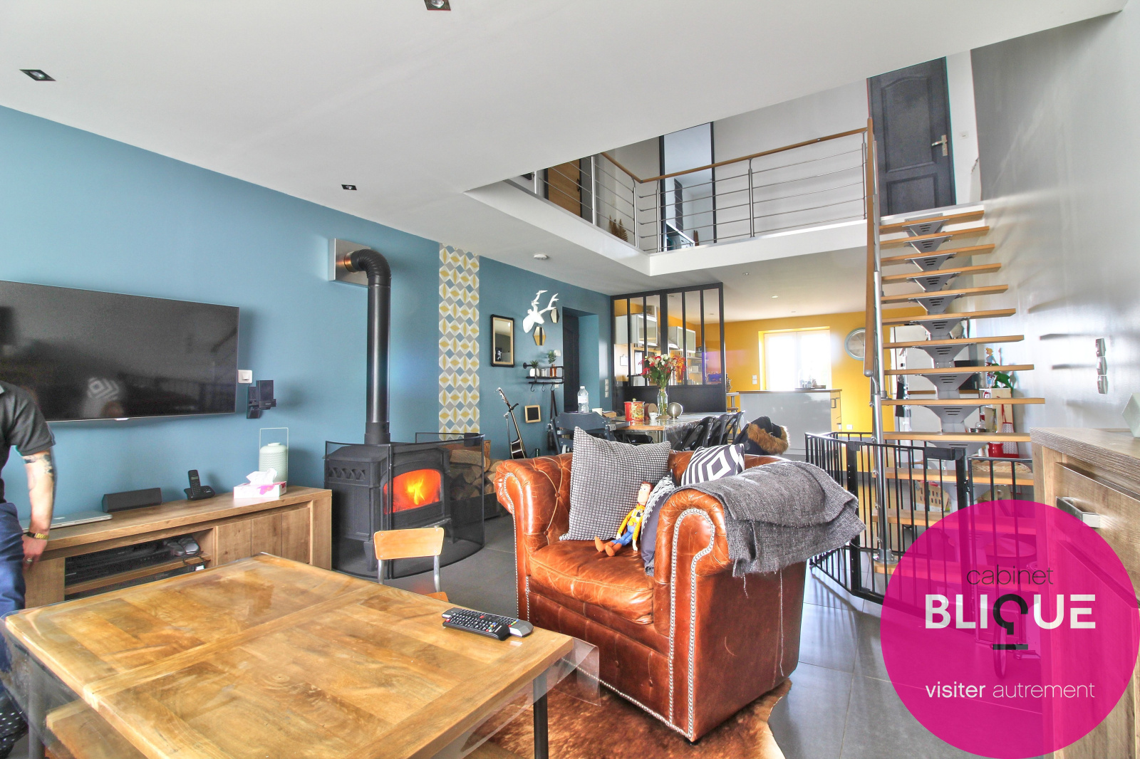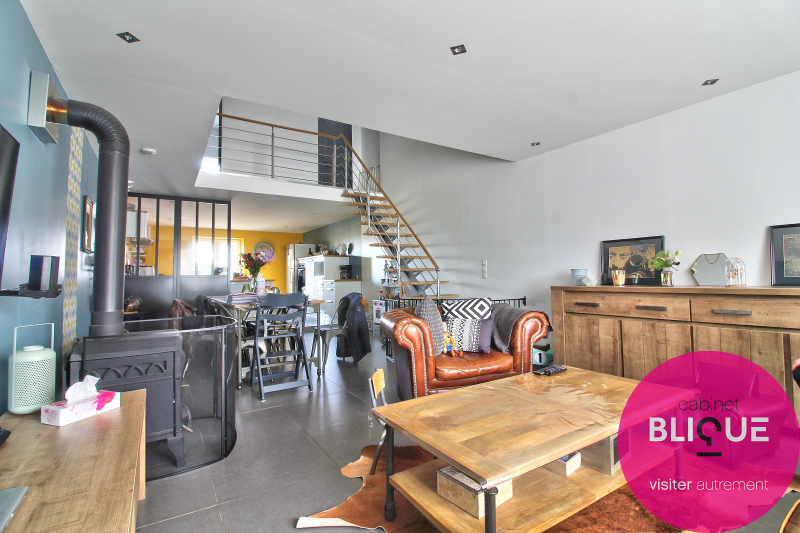 La pièce de vie mesure 50 m² avec une belle hauteur sous plafond, cuisine ouverte à l’américaine, ilot central, accès direct à la terrasse de 50 m² et au jardin de 400 m².