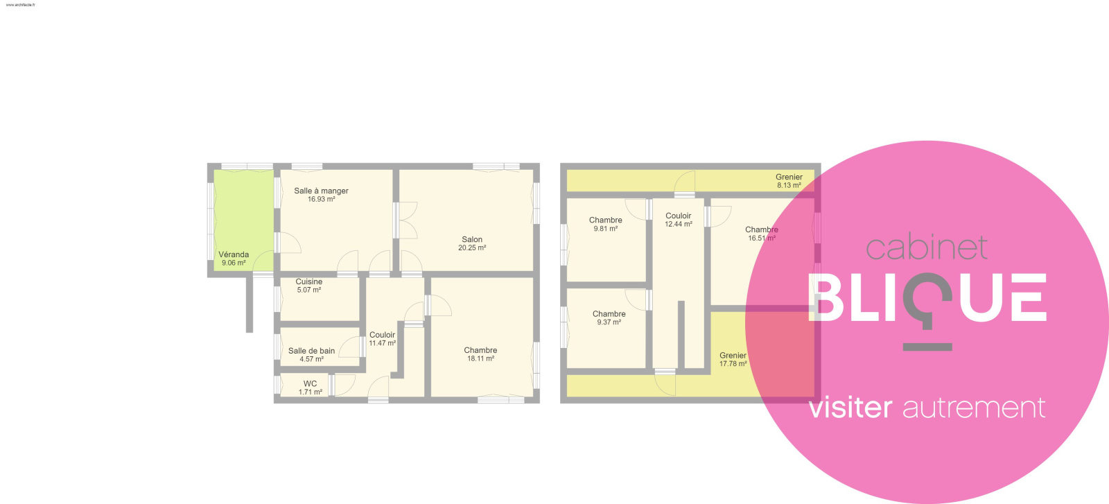 Au premier étage se trouvent trois chambres de 9, 10 et 16.5 m² ainsi que deux greniers facilement aménageables en dressing.