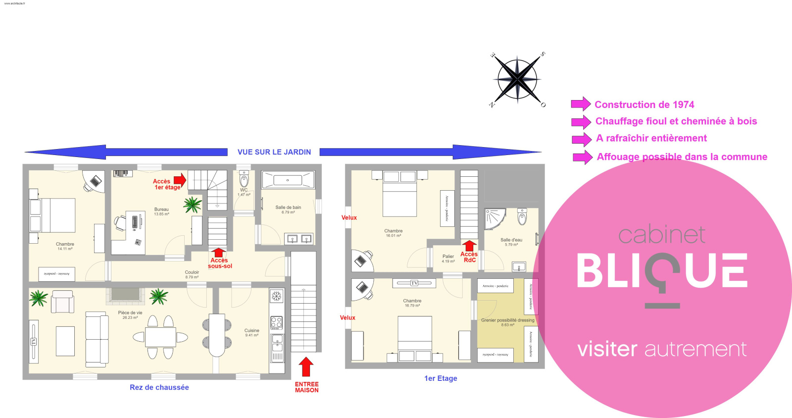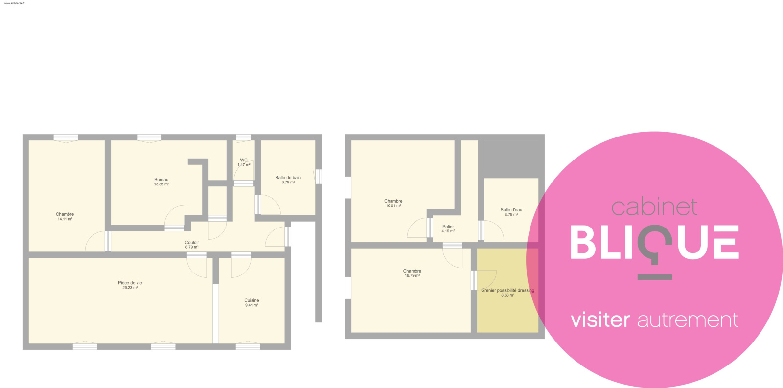Une ruche d’environ 120 m² habitables vous attend, composée, au rez-de-chaussée, d’une pièce de vie de 26 m² avec cuisine à l’américaine de 9 m², un bureau de 13 m², une chambre de 14 m², une salle de bain et de WC séparé.