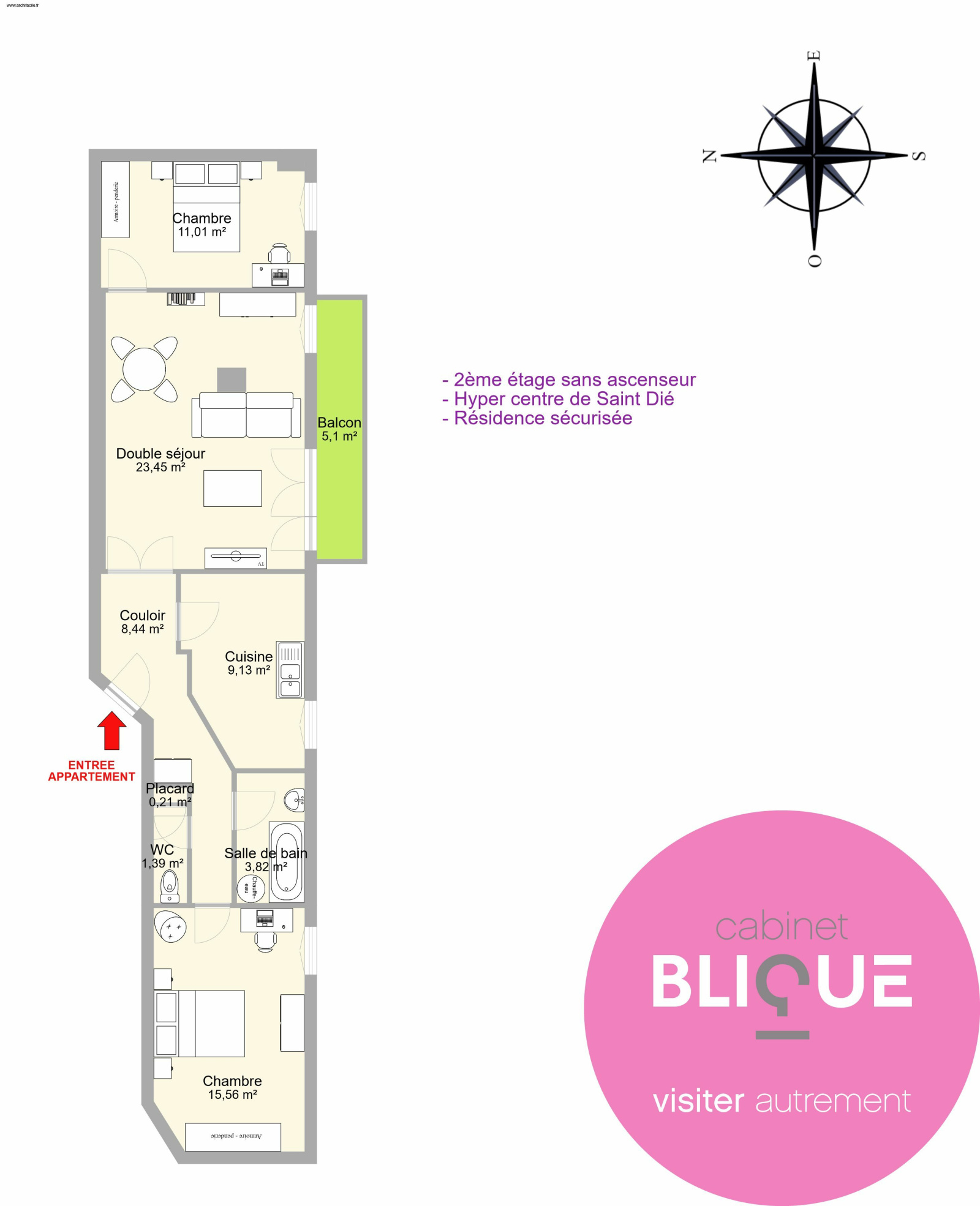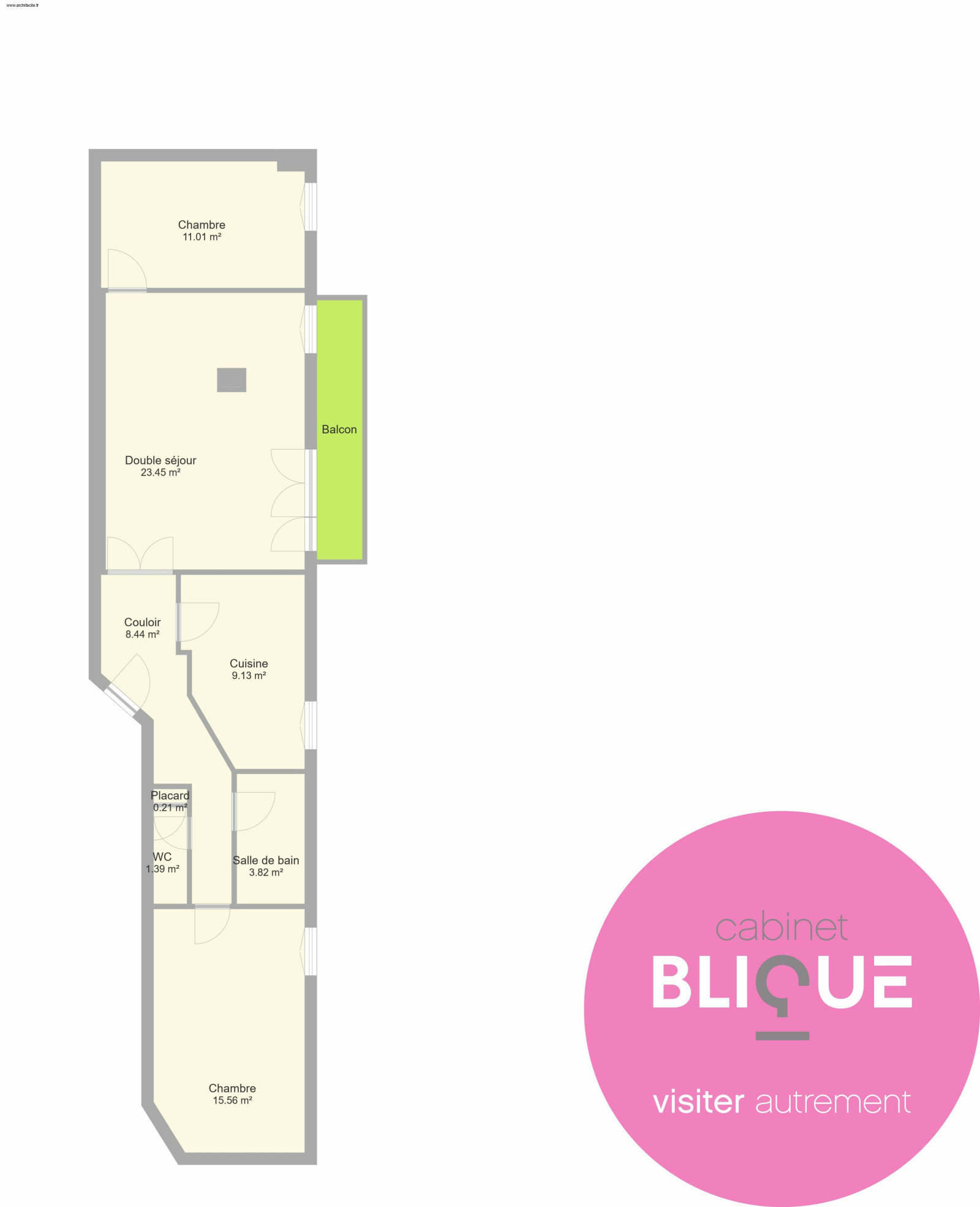 Ses mensurations ne laissent pas indifférent : trois pièces réparties sur 74 m² (surface carrez), avec un balcon de 5 m² donnant sur l’arrière de l’immeuble.